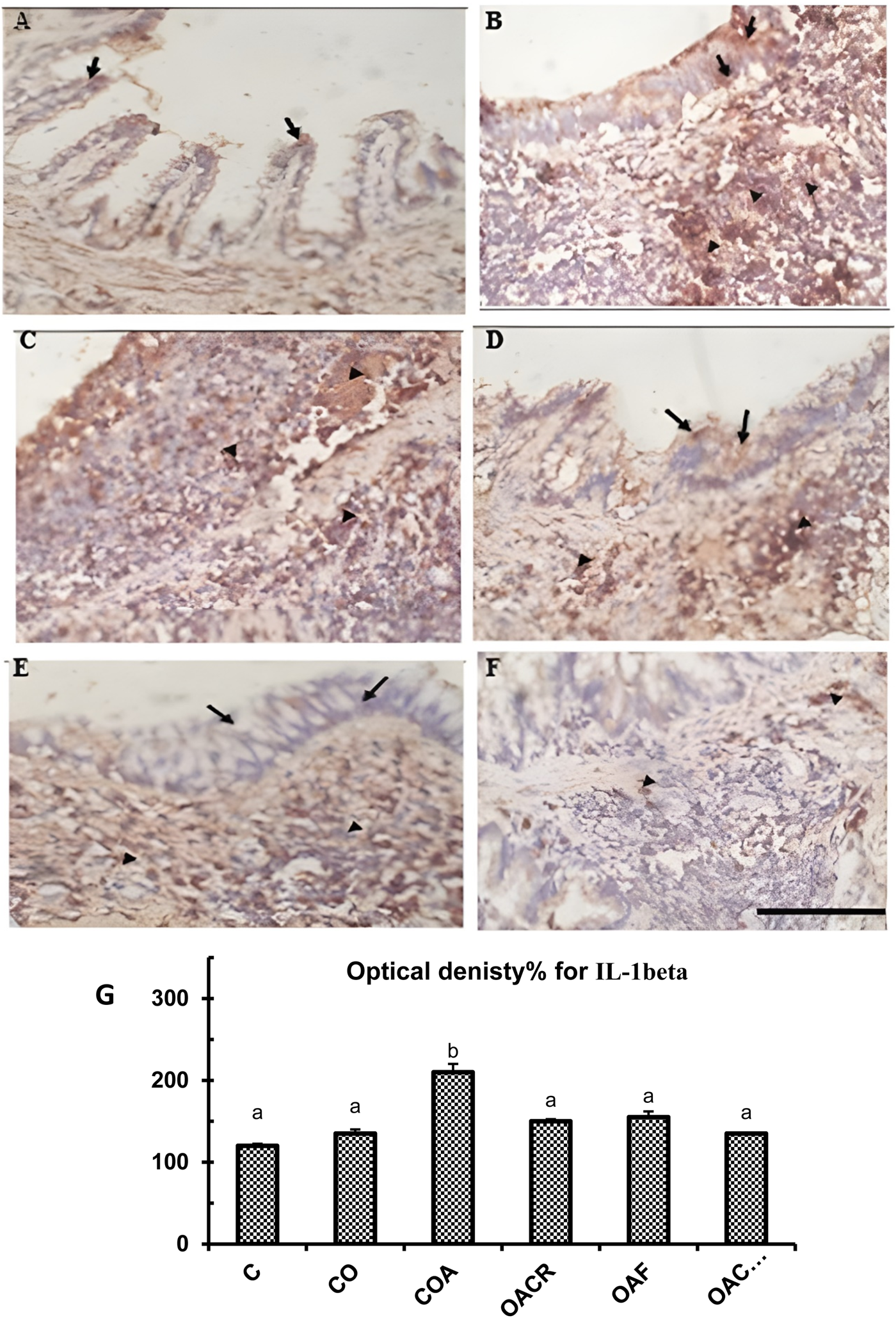 Generally, tissue samples fixed in paraffin were regularly dewaxed, rehydrated, and rinsed in 3% hydrogen peroxide to inhibit endogenous peroxidase. Immunostaining was performed on 4-mm thick, deparaffinized slices and heated for 15 min in a 0.01 M citrate buffer solution (PH = 7) to extract antigen. Mice monoclonal antibodies against interleukin-17 alpha (IL-17α) and interleukin-1beta (IL-1β) were then applied to the sections for an entire overnight (BIO SB, Santa Felicia, USA, Cat. # CA93117). Sections were incubated with HRP-conjugated goat anti-mouse IgG (1:500, Abcam #ab6789) for 1 h. Color was developed with DAB (Vector Labs #SK-4100). Staining intensity was quantified using ImageJ (v1.53).