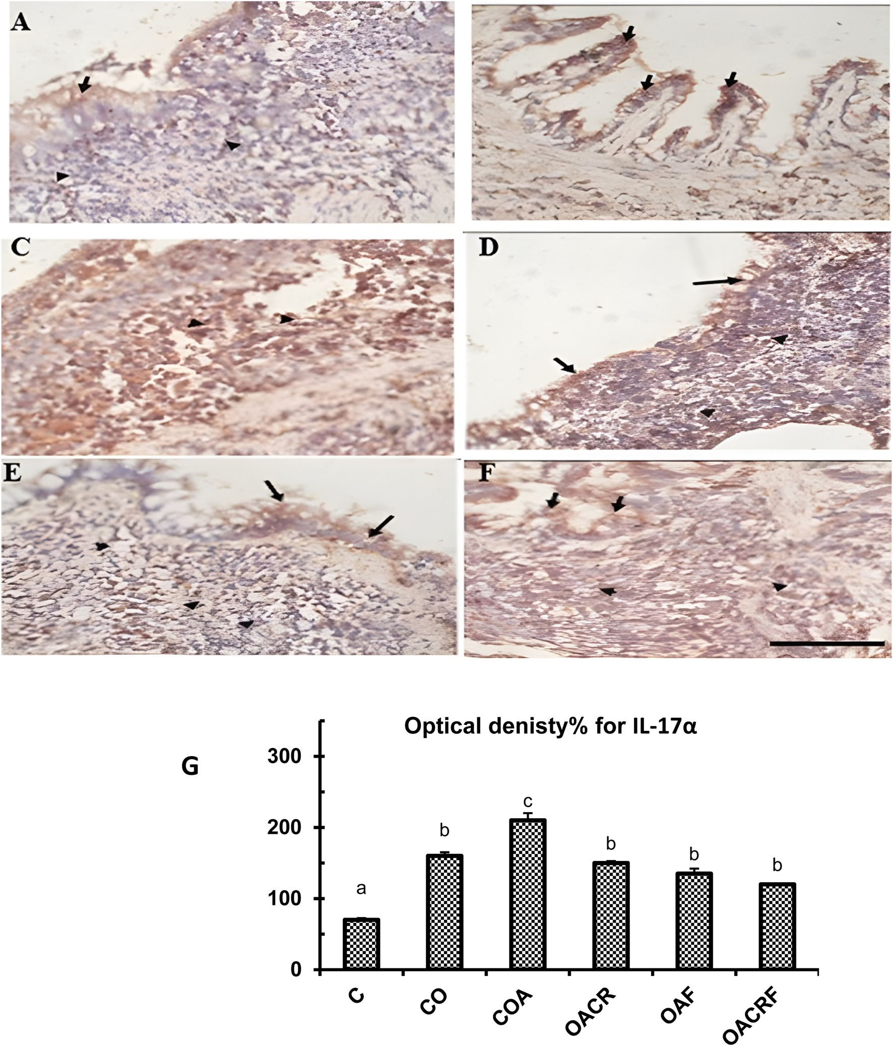 Tumor tissue was assessed. Positive cells were those that expressed IL-1β and IL-17α in the cytoplasm. Guidelines for a semi-quantitative grading system (Ilić et al., 2019). The staining intensity of the reaction (0–3) and the proportion of positive cells (0–5) were added to determine the final grades. The transverse section (T.S) of lung tissue from the control group revealed weak expression of IL-1β in a small number of bronchiolar epithelial cells (IHC, 40x) (Figure 5A). Furthermore, T.S. in lung tissue from the control-obese group revealed weak expression of IL-1β in bronchiolar epithelial cells with moderate expression of IL-1beta in chronic inflammatory cells (IHC, 40x) (Figure 5B). However, strong expressions of IL-1β were observed in chronic inflammatory cells (IHC, 40x) and lung tissue from the control obese-asthmatic group (Figure 5C). Further, there was a weak expression of IL-1β in bronchiolar epithelial cells and chronic inflammatory cells (IHC, 40x) (Figure 5D) observed in lung tissue from the obese-asthmatic group treated with chromium picolinate. Similarly, there was a significant decrease in IL-1β expression was seen in T.S. lung tissue from the formoterol-treated obese-asthmatic group in the epithelial cells of the bronchi (IHC, 40x) along with weak localized expression of IL-1β (Figure 5E). When both formoterol and chromium picolinate were given to the obese-asthmatic group, T.S. in their lung tissue revealed weak expression of IL-1β in a small number of chronic inflammatory cells (IHC, 40x) (Figure 5F).