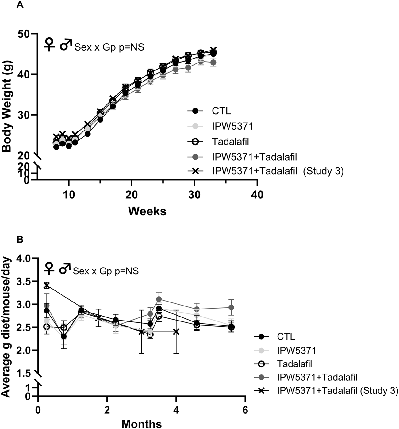 Figure 2. (A) Body weight in grams and (B) food intake as average grams/mouse/day was comparable across all groups of mice in studies 1 and 3, which is indicative that drug exposure did not change caloric consumption and weight gain. There were no significant sex by group interactions (NS = non-significant at p > 0.05), and so male and female mice are shown as combined data in these graphs. Means with standard error bars are shown. GP, Group.