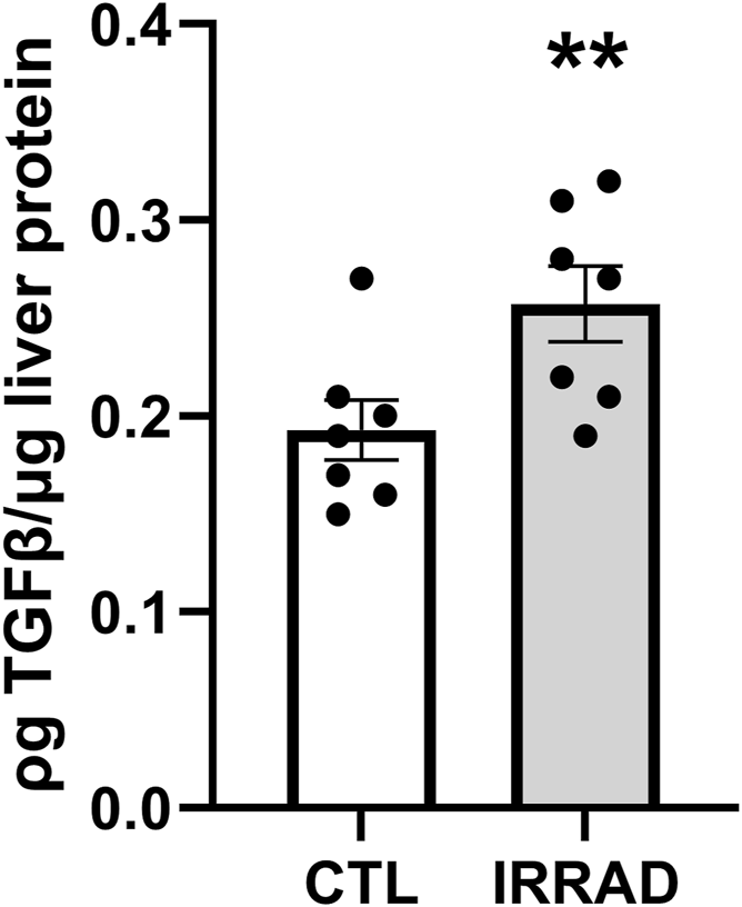 Figure 3. Sub-lethal whole-body irradiation (7Gy) leads to persistently increased transforming growth factor β (TGF-β) in the liver 6 months after exposure. Means with standard error bars are shown. N = 7/group; **p < 0.01.