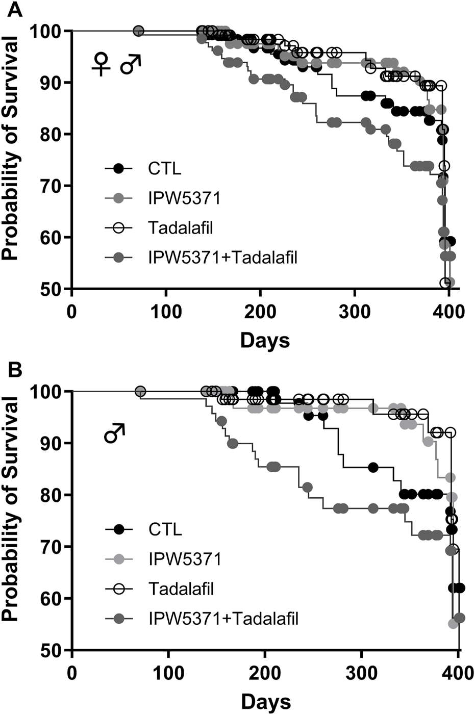 Figure 4. Survival curves for irradiated mice kept on Western diet and treated with experimental anti-fibrotic therapies. Sub-lethal whole-body irradiation was performed on day 30 of diet consumption, and the study end was 365 days later. Pathological outcomes were measured in a subset evaluated at 180 days. (A) Male and female mice together showed that the combination of IPW5371 and tadalafil caused a significantly higher mortality (p < 0.001). (B) The excess risk of death was sex-specific, with only male mice exposed to this drug combination having a significantly higher probability of death (p < 0.001). Female mice had no group differences in survival (data not shown).