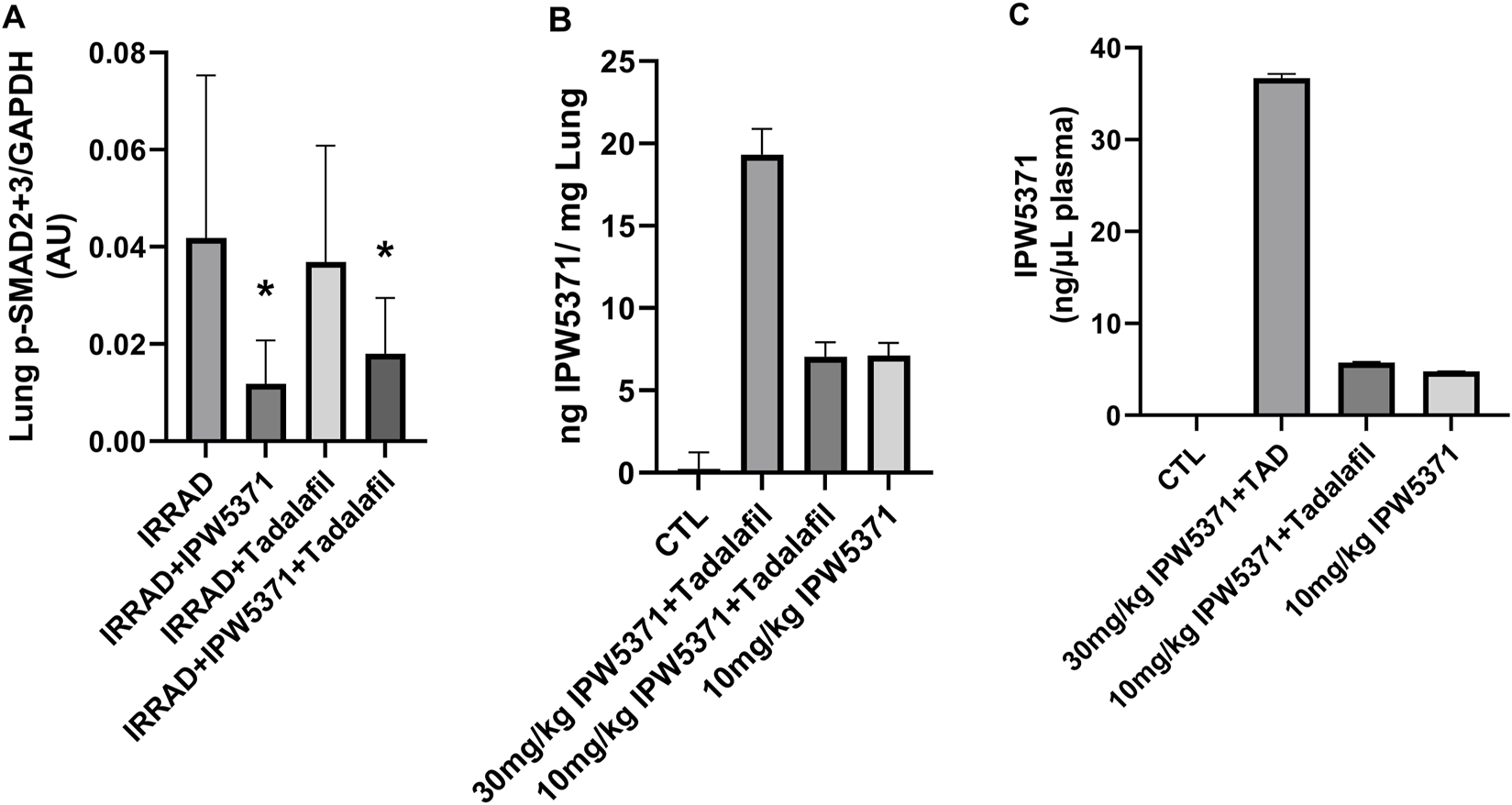 Figure 6. No pharmacokinetic (PK) or pharmacodynamics interaction was observed between anti-fibrotic compounds. (A) TGF-β pathway inhibition, measured by activation of SMAD2/3, was selectively reduced with IPW5371 (30 mg/kg; male and female mice n = 6–8/group). (B) Tissue concentrations of IPS5371 were dose-proportional at 10 and 30 mg/kg doses with no effect of tadalafil co-administration (male mice, n = 4–6/group). (C) Plasma concentrations of IPW5371 confirm no PK interaction of agents (male mice, n = 4–6/group). Means with standard error bars are shown.