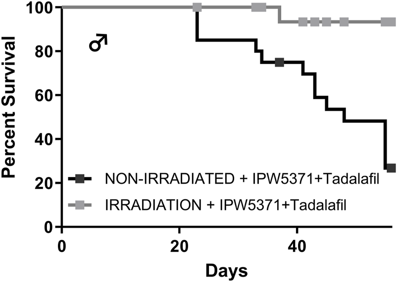 Study 3: the adverse effects on the cardiovascular integrity that resulted from co-administration of PDE5 and TGFβR1 inhibition in irradiated mice were confirmed to be generalized and not specific to the irradiated mouse model. Non-irradiated male mice compared to irradiated male mice had significantly worse survival while undergoing the same experimental protocol (Figure 7; p < 0.001 for median survival). Un-irradiated mice dosed only with IPW5371 or tadalafil were not evaluated. Mortality was observed in less than 14 days after drug exposure was initiated, and histological lesions were replicated to those seen in irradiated mice (Table 5). Frequencies of lesions in drug-treated mice were significantly higher for inflammation and mixed cell infiltrates in the great vessels, heart, and coronary arteries. The frequency of lesion severity is tabulated in Table 6. We speculate that the pro-fibrotic processes initiated by irradiation may have delayed and reduced the detrimental effects of the anti-fibrotic drug combination, leading to better survival rates in the first 100 days post-radiation exposure (Figures 4B, 6).
