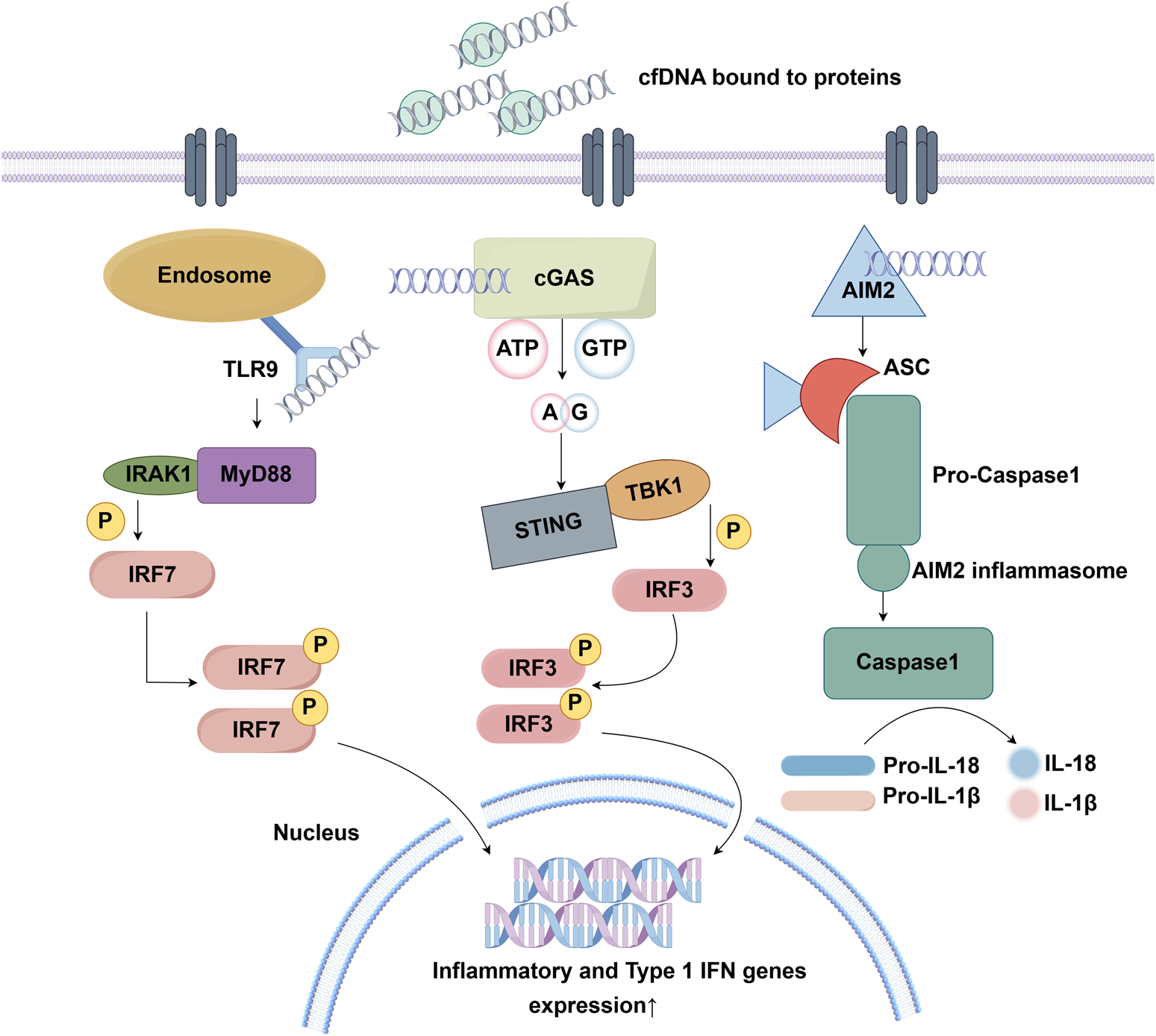 Intracellular immune signaling pathways related to cfDNA. cfDNA has the ability to attach to specific proteins, including antimicrobial peptides and antibodies, creating complexes that enhance cell absorption of cfDNA and safeguard it against breakdown. Upon entering the cell, cfDNA gets identified by DNA receptors like TLR-9, cGAS, and AIM2, triggering signaling pathways and prompting the generation of inflammatory cytokines, which eventually results in inflammation. The figure is made using Figdraw.