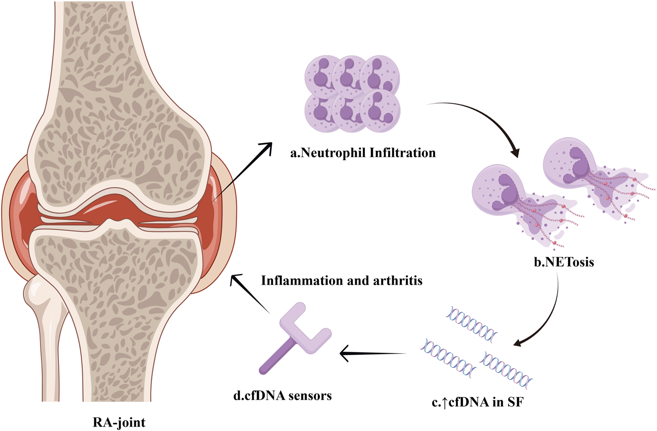 Intense NETosis within the synovium of RA-joint. Infiltration of neutrophils occurs within the synovium of RA patients, and a large number of neutrophils undergo NETosis. The massive formation of NETs leads to a significant increase in cfDNA concentration in the synovial fluid. Sensors for nucleic acid are capable of identifying high levels of cfDNA and triggering inflammation pathway, thereby accelerating synovitis development. The figure is made using Figdraw.