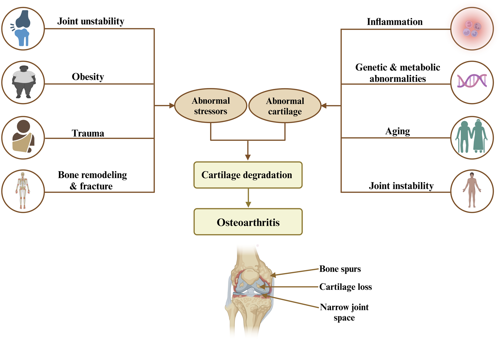Risk factors and mechanisms leading to osteoarthritis highlight the interplay between abnormal stress, cartilage degradation, and resulting joint damage, including bone spurs, cartilage loss, and narrow joint space.