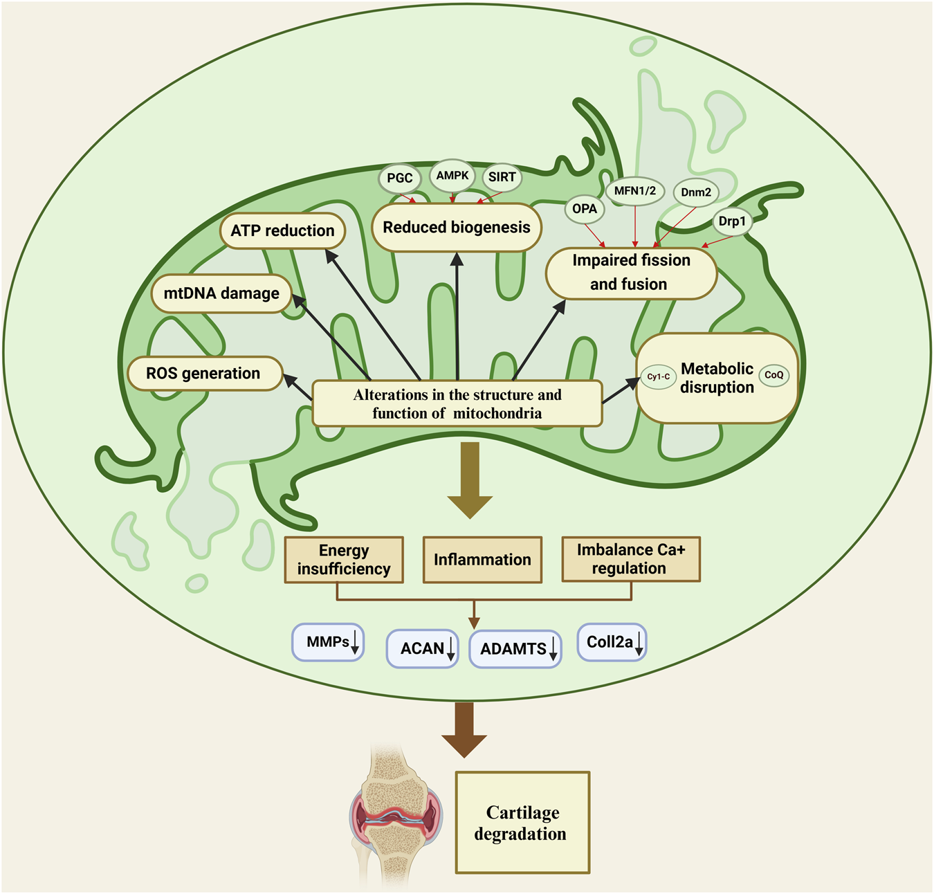 | TFAM | Downregulated | Suppress mitochondrial biogenesis while promoting catabolic reactions to IL-1β, leading to an increased release of MMP-3, MMP-13, and nitric oxide | Wang et al. (2015), Bao et al. (2021) |