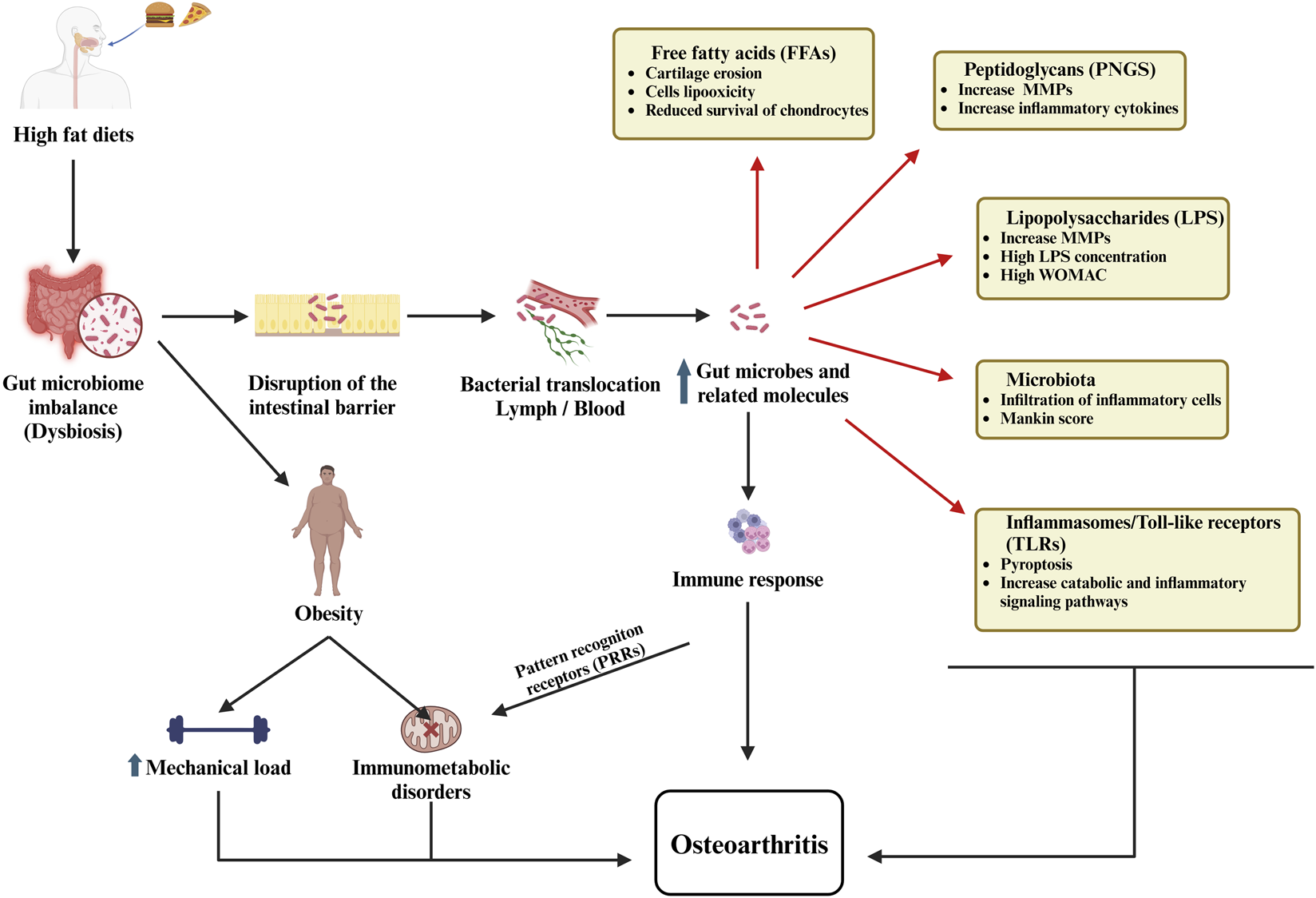 The role of the gut microbiome in osteoarthritis illustrates how dysbiosis, intestinal barrier dysfunction, bacterial translocation, immune activation, and metabolic disturbances collectively contribute to the development and progression of the disease.
