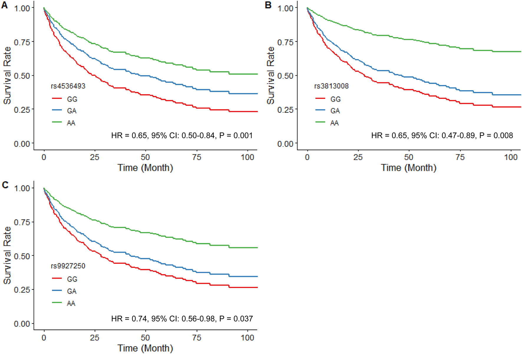 Estimated adjusted time-to-event survival curves of SLC5A2 SNPs in SGLT2i-naïve patients. (A) rs4536493 (N = 179 for G/G, N = 116 for G/A, and N = 23 for A/A), (B) rs3813008 (N = 230 for G/G, N = 79 for G/A, and N = 9 for A/A), and (C) rs9927250 (N = 212 for G/G, N = 92 for G/A, and N = 14 for A/A). Lines denote the homozygous reference genotype (red), the heterozygous genotype (blue) and the homozygous variant genotype (green) respectively.