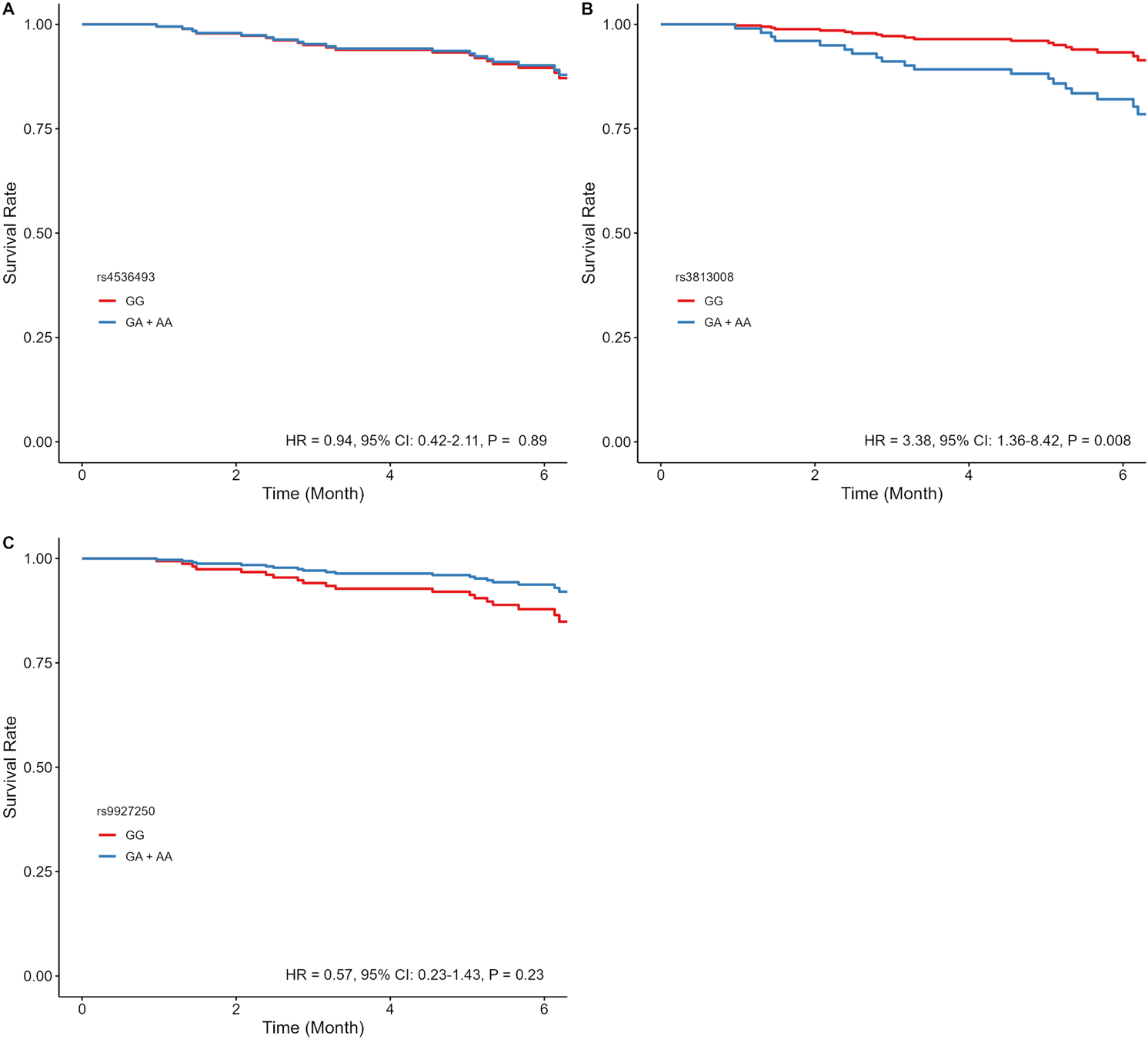 Estimated adjusted time-to-event survival curves of SLC5A2 SNPs in dapagliflozin-treated patients. (A) rs4536493 (N = 86 for G/G, and N = 103 for G/A + A/A), (B) rs3813008 (N = 124 for G/G, and N = 66 for G/A + A/A), and (C) rs9927250 (N = 120 for G/G, and N = 68 for G/A+ A/A). Lines denote the homozygous reference genotype (red), and the heterozygous and homozygous variant genotypes (blue).