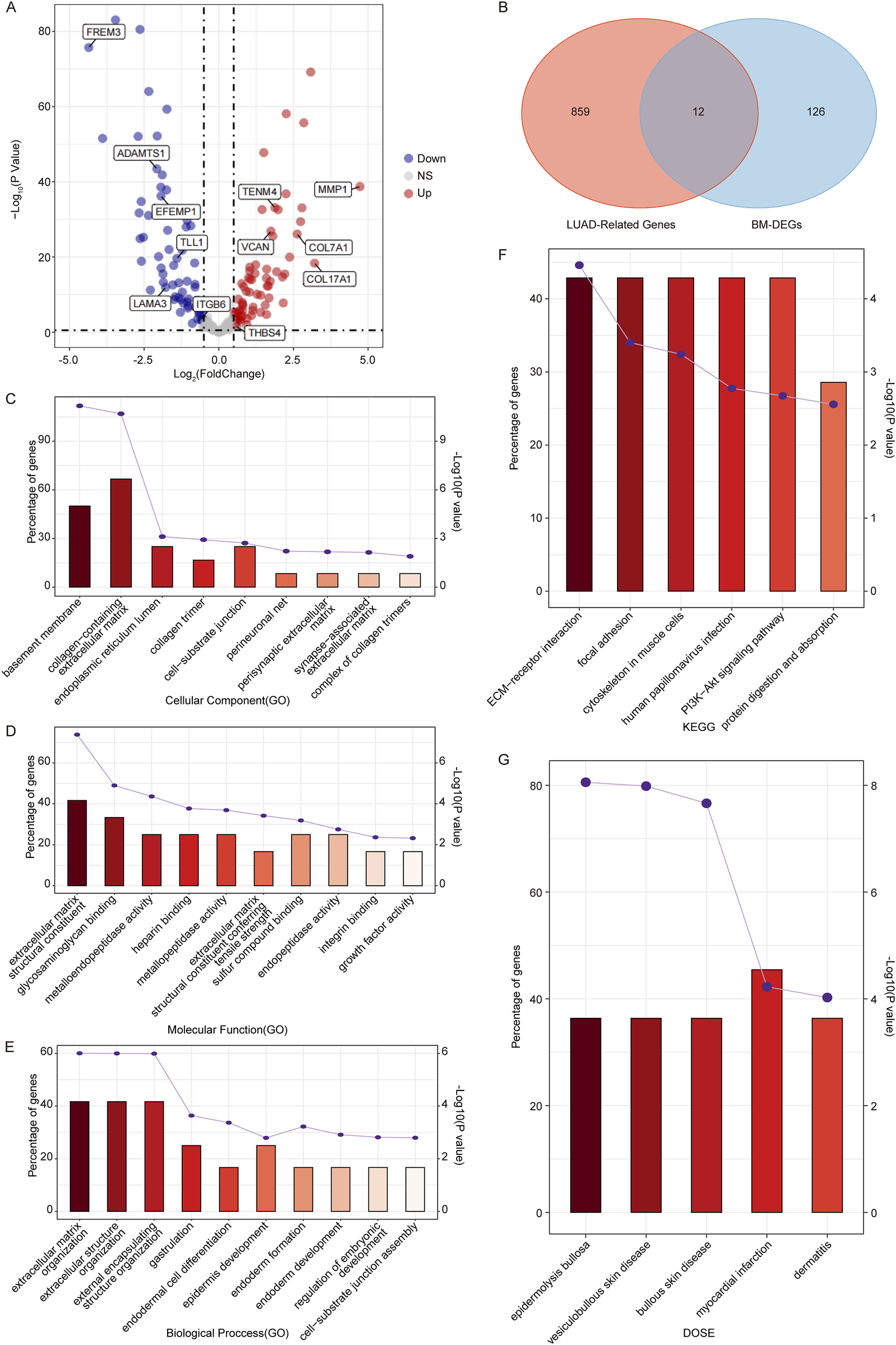 Identification of candidate genes associated with BM in LUAD. (A) Volcano plots of BM-related DEGs between LUAD samples and controls in the TCGA dataset. (B) Venn diagram of the WGCNA module genes and BM-DEGs. (C, E) The GO terms including CC (C), MF (D), and BP (E) of candidate genes. (F, G) The KEGG pathway enrichment (F) and DO enrichment (G) of candidate genes. (If more than 10 pathways, only the top 10 pathways with the smallest p-value were shown.)