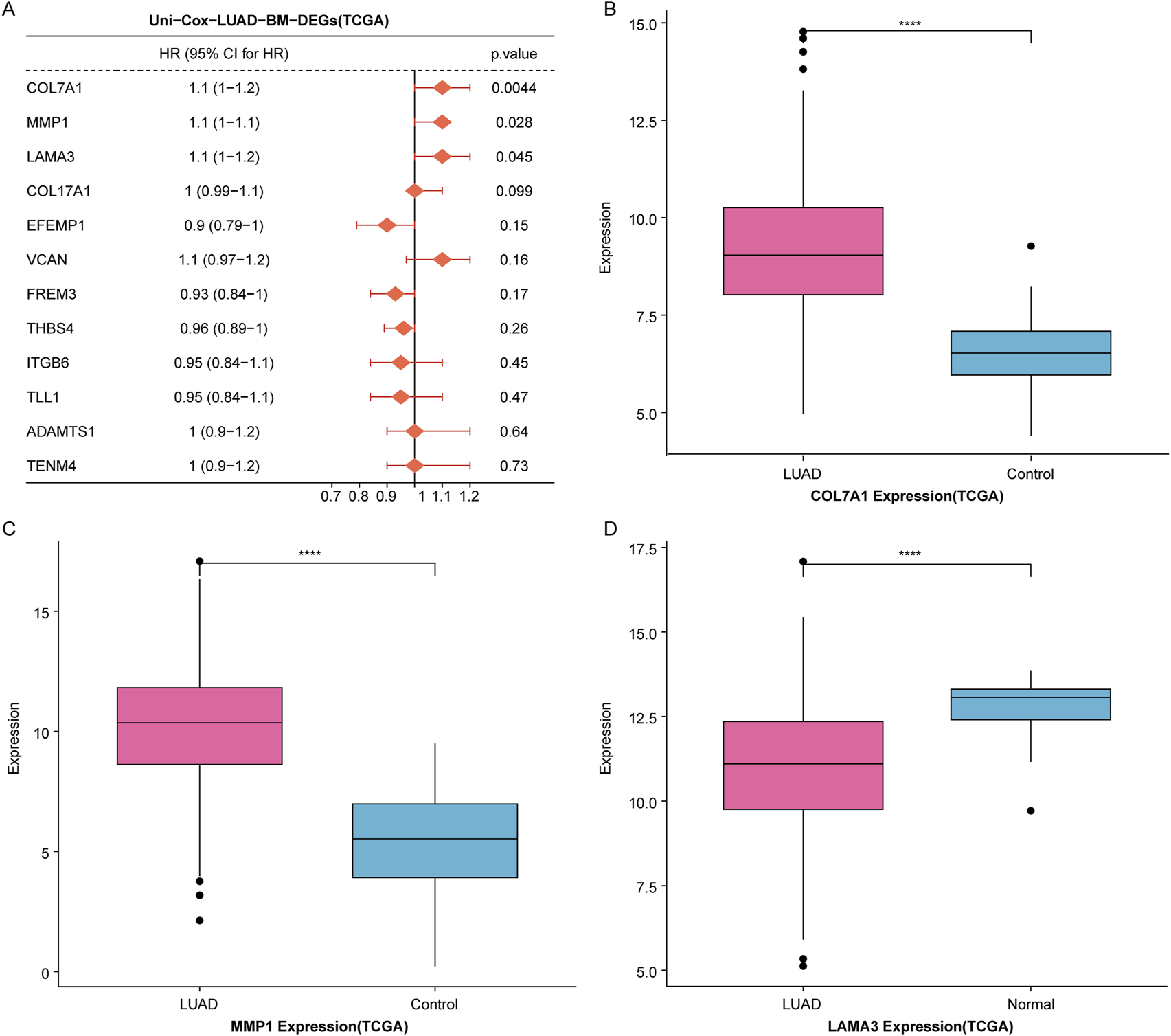 Identification of COL7A1 as a BM-related key biomarker in LUAD. (A) Univariate Cox regression analysis of 12 candidate genes. (B–D) The expression levels of three prognosis-associated genes, including COL7A1(B), MMP1(C), and LAMA3(D), in LUAD samples and controls of the TCGA dataset (*p < 0.05, **p < 0.01, ***p < 0.001).