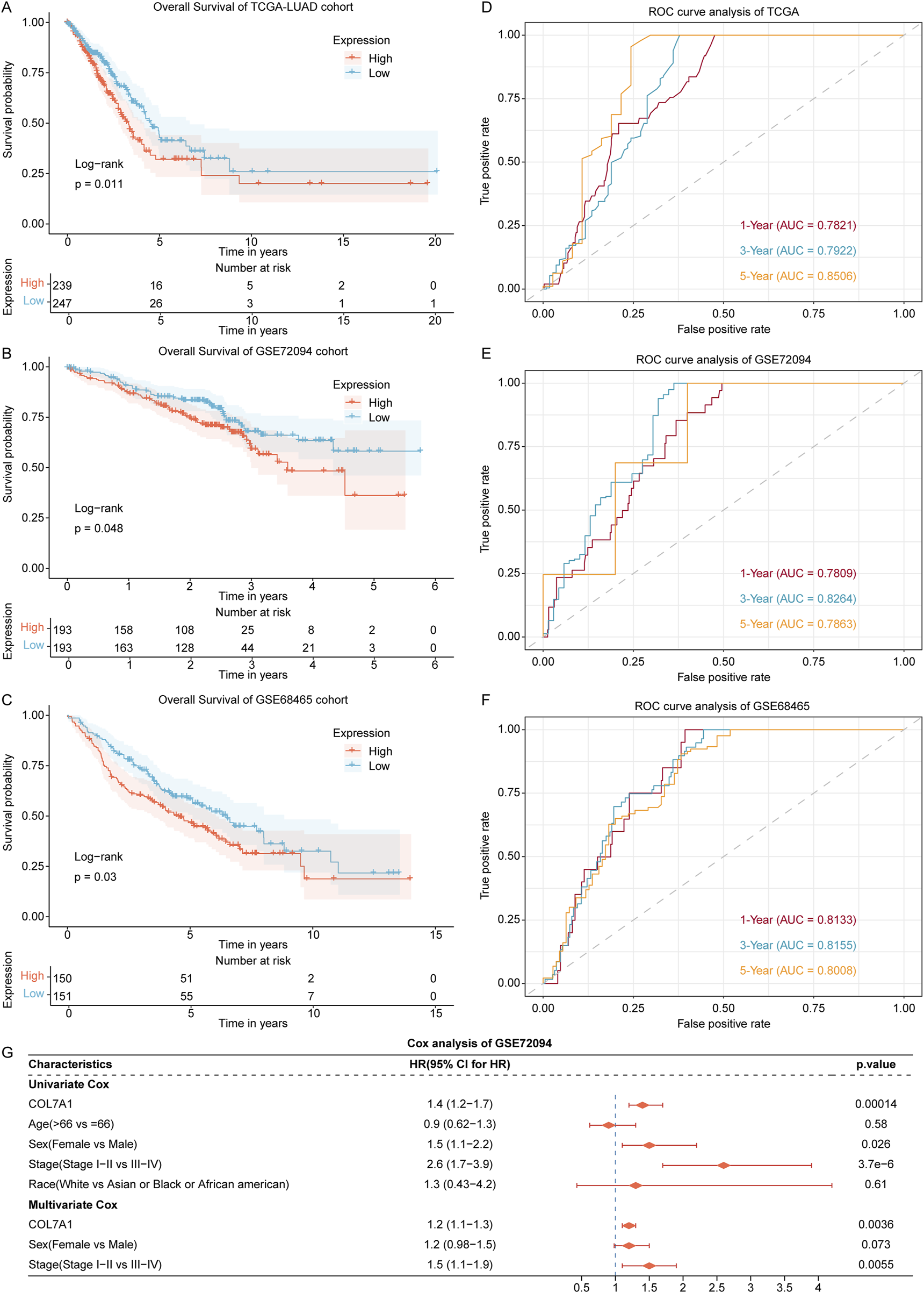 Exploration of the association of COL7A1 expression with prognosis of LUAD patients. (A–C) The Kaplan-Meier curves of COL7A1 high expression and COL7A1 low expression groups in the LUAD patients of TCGA (A), GSE72094 (B), and GSE68465 (C) datasets. (D–F) Time-dependent ROC curves of the COL7A1 expression for predicting 1-, 3-, and 5-year survival in the TCGA (D), GSE72094 (E), and GSE68465 (F) datasets. (G) Univariate and multivariate Cox regression analysis of COL7A1 expression and clinical features including age, gender, clinical stage, and race.