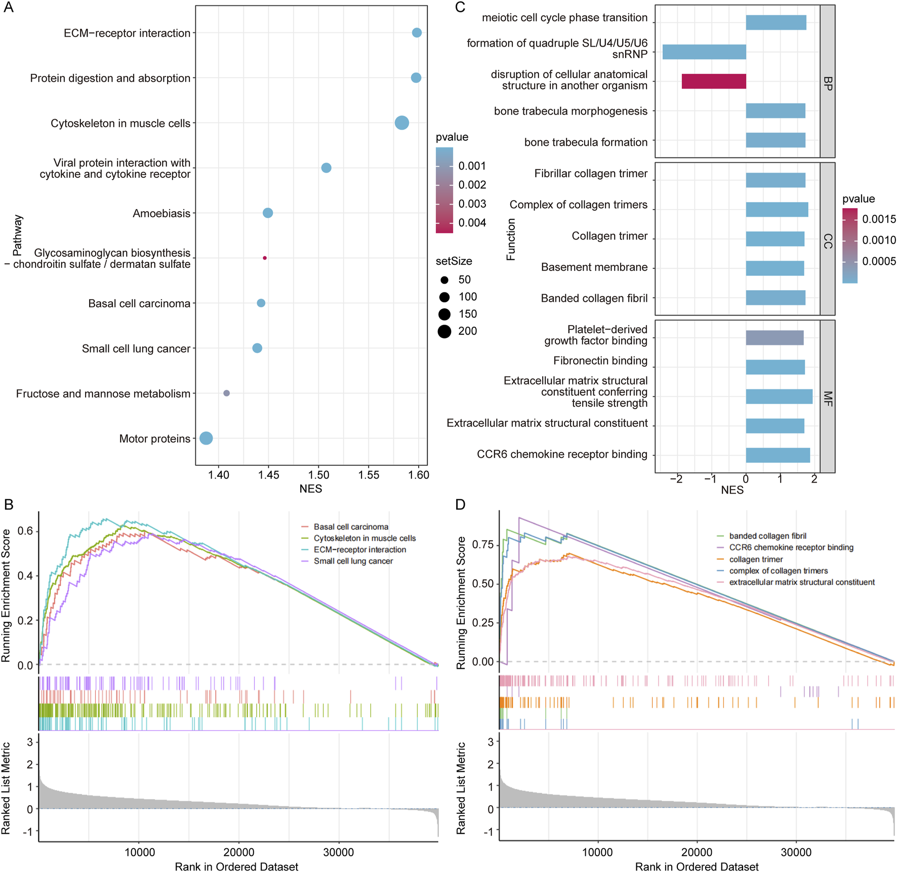 Exploration of the biological significance of different COL7A1 expression groups. (A) The top 10 KEGG pathways with significant differences between the high COL7A1 expression and low COL7A1 expression groups. (B) Five important KEGG pathways were activated in the high COL7A1 expression group based on GSEA. (C) The top 5 GO terms with significant differences between the high COL7A1 expression and low COL7A1 expression groups. (D) Five important GO terms were activated in the high COL7A1 expression group based on GSEA.