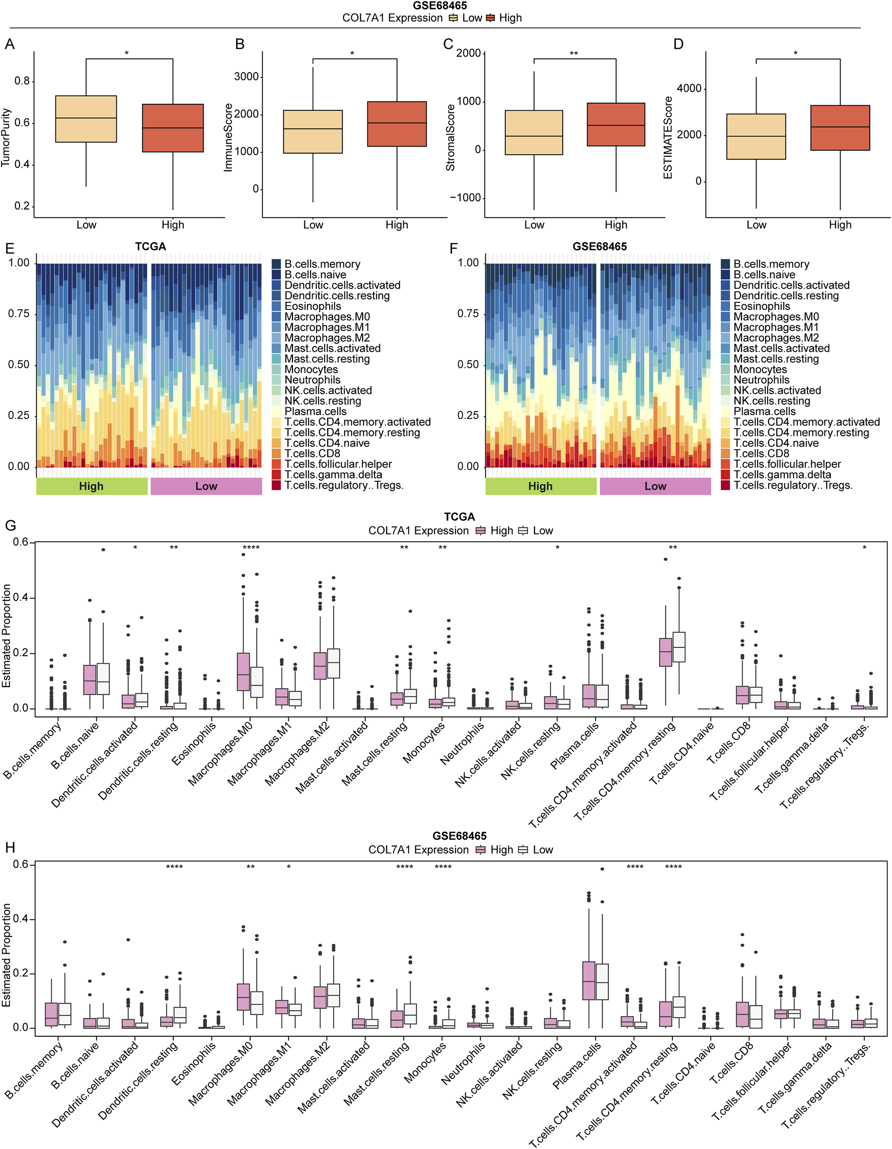 The landscape of immune cell infiltration between different groups. (A–D) Box plot of tumor purity (A), immune (B), stromal (C), and ESTIMATE (D) scores in different COL7A1 expression groups based on the GSE68465 dataset. (E, F) TStacked plot of 22 immune cell types in each sample of TCGA-LUAD (E) and GSE68465 (F) cohorts. (G, H) The 22 immune cell infiltration in the high COL7A1 expression and low COL7A1 expression groups of TCGA-LUAD (G) and GSE68465 (H) cohorts. (*p < 0.05, **p < 0.01, ***p < 0.001)