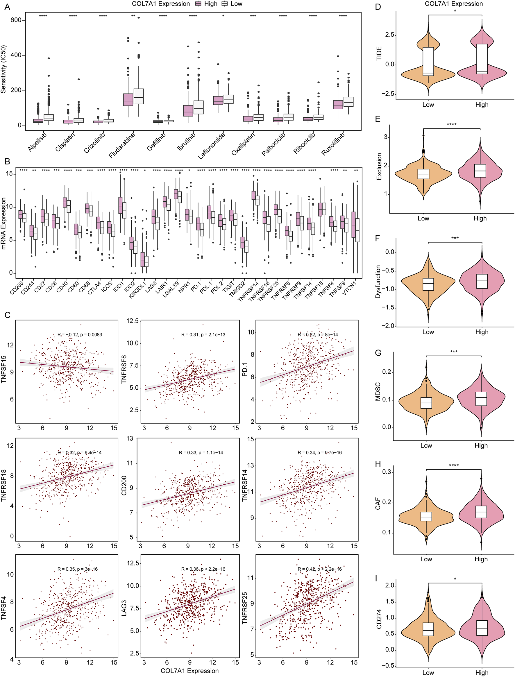 Validation of COL7A1 expression in predicting the clinical benefit of immunotherapy. (A) IC50 values of the 11 drugs in the COL7A1-H and COL7A1-L groups. (B) The expression levels of immune checkpoint genes in different COL7A1 expression groups. (C). Correlation analysis of immune checkpoint genes and COL7A1 expression (the data conformed to normal distribution, employing pearson correlation analysis) (D–I) Violin plots of TIDE (D), Exclusion (E), Dysfunction (F), MDSC (G), CAF (H), and CD274 (I) scores in different COL7A1 expression groups.