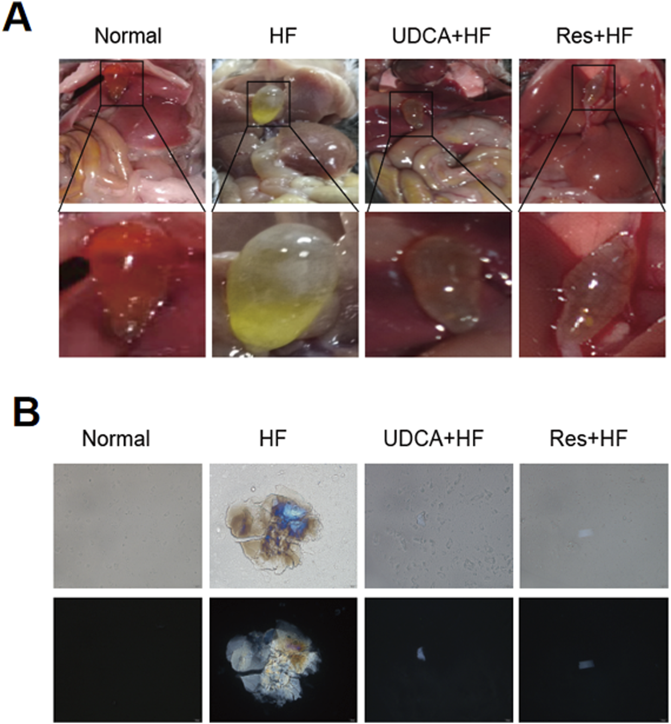 Resveratrol alleviates the occurrence of gallstones. (A) Representative images of gallbladder appearance from mice in the Normal, HF, UDCA + HF, and Res + HF groups. HF: high-fat diet, UDCA: ursodeoxycholic acid, Res: resveratrol. (B) Polarized light microscopic images showing bile crystals in the gallbladders of mice from each treatment group.