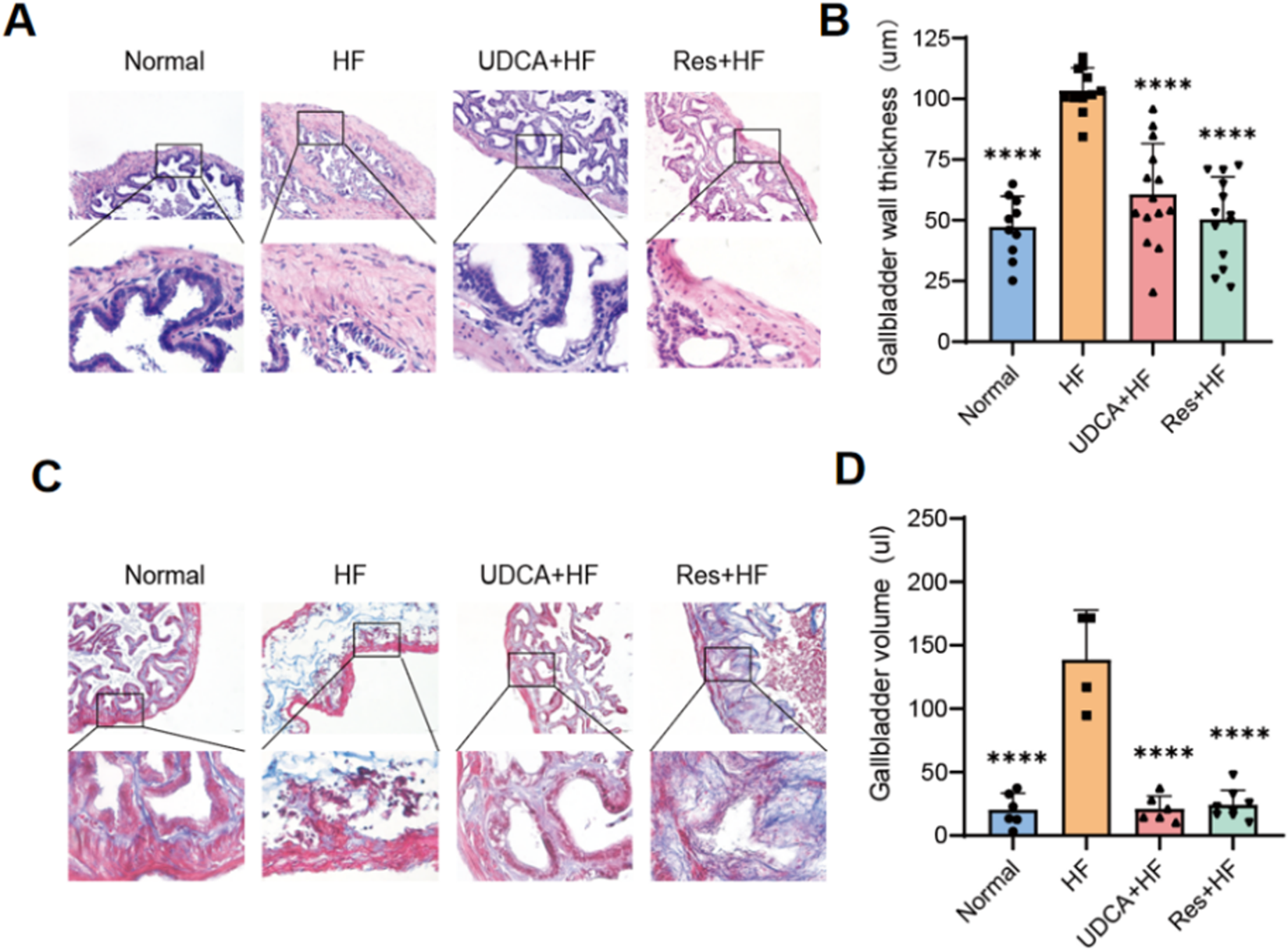 Histological analysis of mouse gallbladder tissues using H&E staining revealed that the gallbladder tissues in the Normal group showed no signs of congestion or significant inflammatory cell infiltration (Figure 2A). In contrast, the HF group displayed extensive infiltration of inflammatory cells in the gallbladder tissue. Notably, the groups treated with ursodeoxycholic acid and resveratrol showed significant improvement, exhibiting minimal edema and only a small amount of inflammatory cell infiltration.
