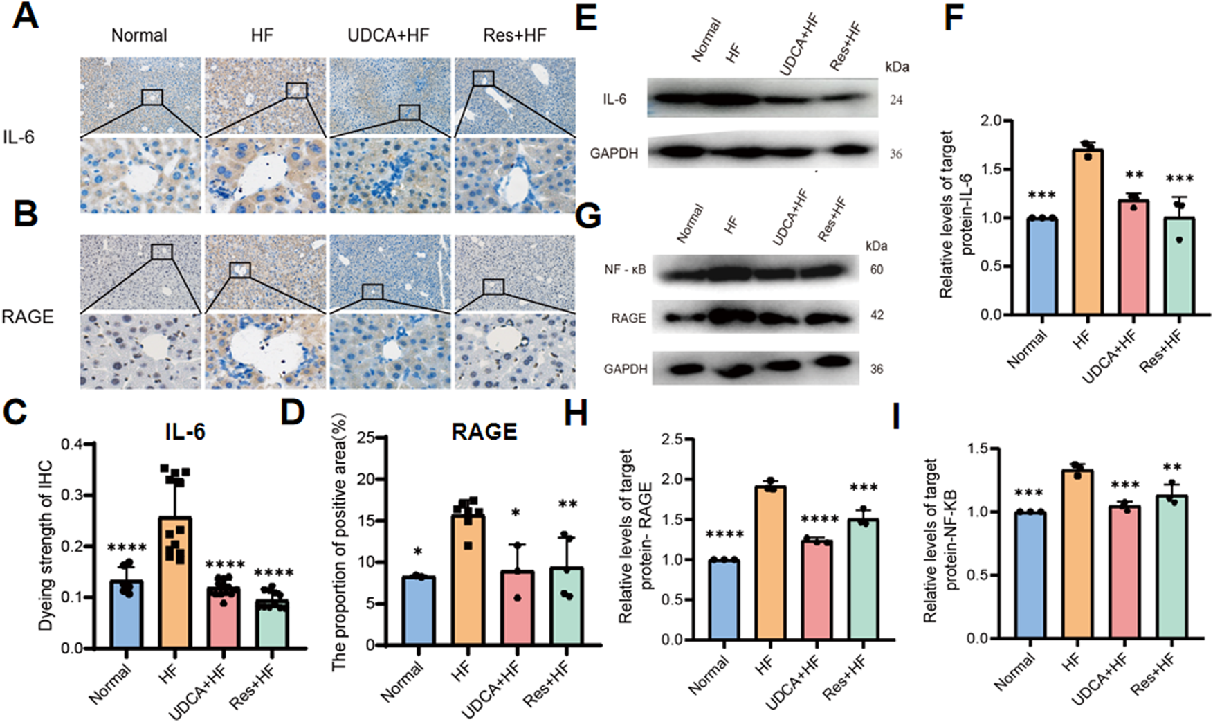 Resveratrol suppresses hepatic inflammation by inhibiting RAGE production. (A) Representative IHC staining IL-6 in liver tissues from four experimental groups. (B) Representative IHC staining for RAGE in liver tissues from four experimental groups. (C) Quantitative analysis of IL-6 staining intensity, presented as a histogram showing the enhancement in staining (n = 8). (D) Histogram depicting the percentage of the immunohistochemistry positive area of RAGE in liver tissues (n = 4∼6). (E) Western blot analysis of IL-6 protein levels in liver tissue samples. (F) Quantification of IL-6 protein levels expressed relative to control (n = 3). (G) Western blot analysis of NF-κB and RAGE protein expression in liver tissues. (H) Quantification of RAGE protein expression, relative to control (n = 3). (I) Quantification of NF-κB protein expression, relative to control (n = 3). HF: high-fat diet, UDCA: ursodeoxycholic acid, Res: resveratrol. Data are presented as mean ± SEM. Statistical significance was assessed by one-way ANOVA with Tukey’s post hoc test. *P < 0.05, **P < 0.01, ***P < 0.001, ****P < 0.0001.