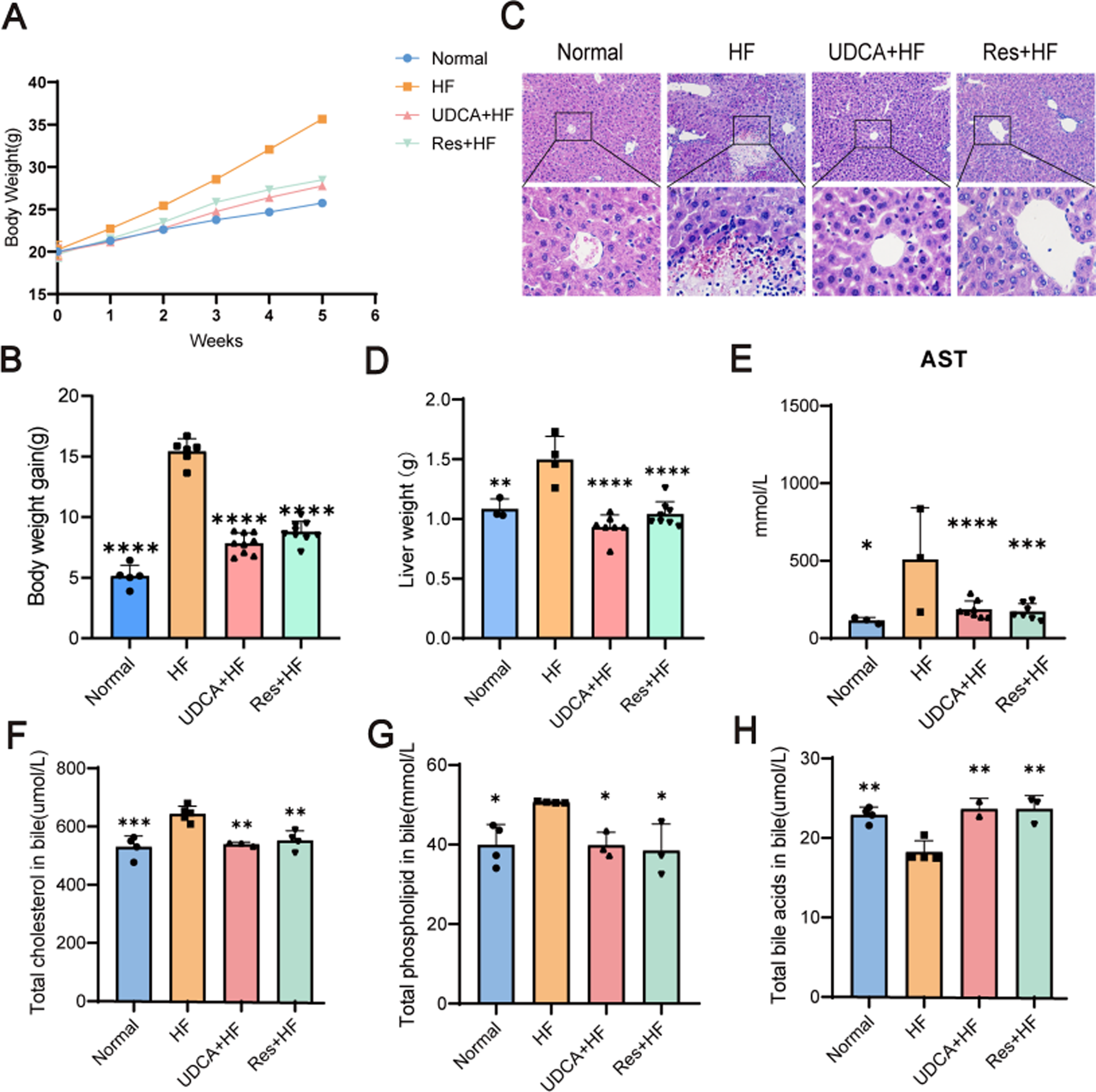 The therapy effects of resveratrol. (A) The body weight curves of mice in the Normal, HF, UDCA + HF, and Res + HF groups. (B) Total body weight gain in the different treatment groups over the study period (n = 5∼8). (C) Representative H&E staining images of liver tissues from mice in the four experimental groups. (D) Liver weight measurements in each treatment group (n = 5∼8). (E) Serum AST levels in the different groups (n = 5∼8). (F) Cholesterol content in the biliary system of mice (n = 4). (G) Phospholipid levels in the bile of treated and control mice. (H) Bile acid content in the bile fluid of mice. HF: high-fat diet, UDCA: ursodeoxycholic acid, Res: resveratrol. Data are presented as mean ± SEM. Statistical significance was assessed by one-way ANOVA with Tukey’s post hoc test. *P < 0.05, **P < 0.01, ***P < 0.001, ****P < 0.0001.