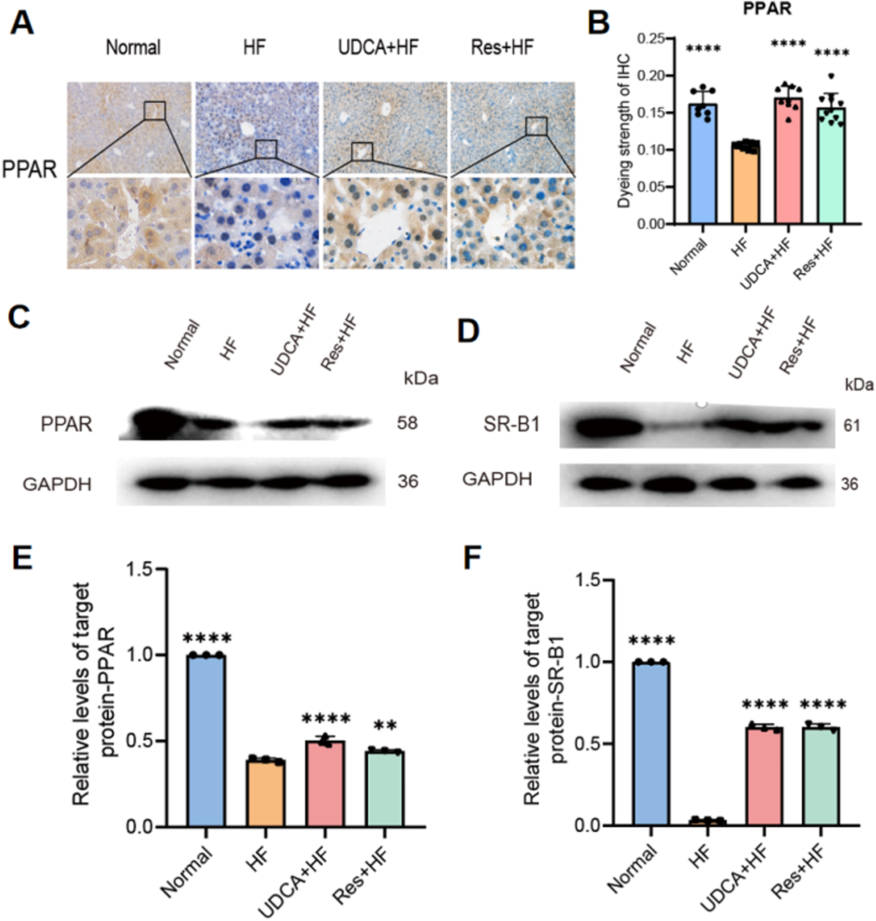 Effects of resveratrol on protein expression in hepatic cholesterol metabolism. (A) Representative IHC staining for PPAR-γ in liver tissues from the four experimental groups. (B) Quantification of PPAR-γstaining intensity, presented as a histogram (n = 8). (C, D) Western blot analysis showing the expression of (C) PPAR and (D) SR-BI protein. (E) Relative expression levels of PPAR protein from western blot analysis (n = 3). (F) Relative expression levels of SR-BI protein from western blot analysis (n = 3). HF: high-fat diet, UDCA: ursodeoxycholic acid, Res: resveratrol. Data are presented as mean ± SEM. Statistical significance was assessed by one-way ANOVA with Tukey’s post hoc test. *P < 0.05, **P < 0.01, ***P < 0.001, ****P < 0.0001.