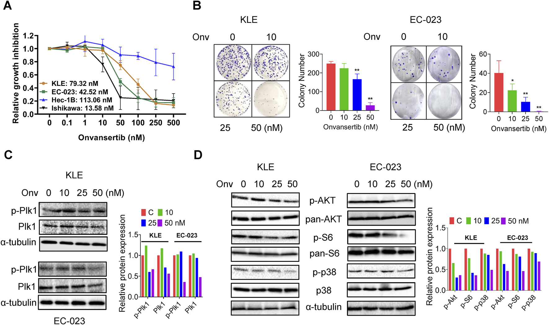 Effect of onvansertib on cell proliferation in EC cells. The KLE, EC-023, HEC-1B, and Ishikawa cells were treated with onvansertib at 0.1–500 nM for 72 h. Cell proliferation was detected by MTT assay. Onvansertib inhibited the proliferation of the 3 cell lines in a dose-dependent manner (A). The KLE and EC-023 cells were treated with 10, 25, and 50 nM of onvansertib for 48 h and continually cultured for 10–14 days. Onvansertib inhibited the colony formation in both cell lines (B). Western blotting results showed that onvansertib inhibited the expression of phosphorylated Plk1 and Plk1in both cell lines (C). Western blotting results showed that onvansertib inhibit the expression of phosphorylated AKT, phosphorylated S6, and phosphorylated p38 in both cell lines after treatment for 24 h (D). *p < 0.05, **p < 0.01.