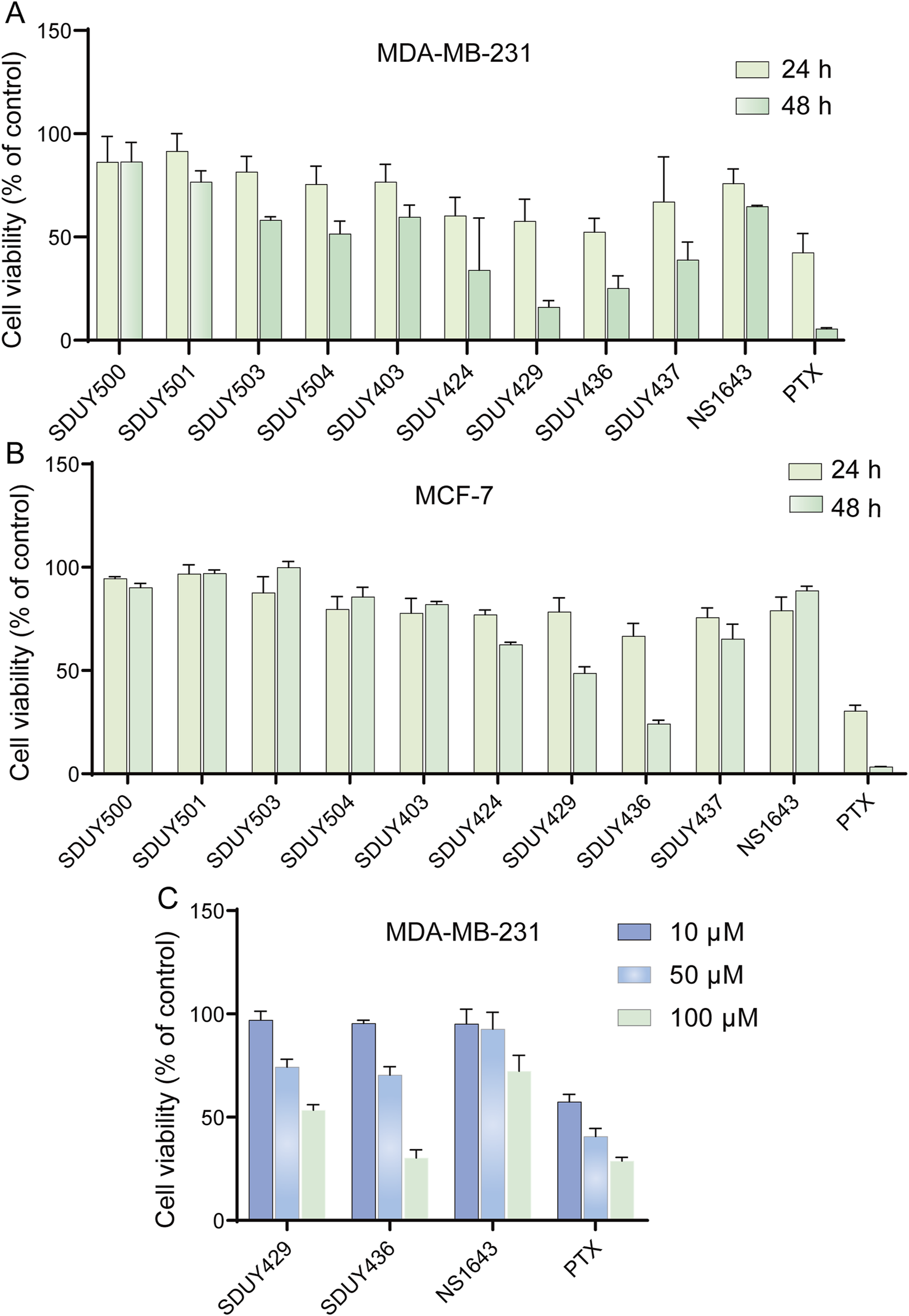 SDUY429 and SDUY436 were further assessed for their antitumor activity in MDA-MB-231 and MCF-7 cell lines through a panel of cellular experiments. As illustrated in Figure 3C, both SDUY429 and SDUY436 elicited a concentration-dependent reduction in cell viability of MDA-MB-231 cells within a 24-h exposure time. At 10 μM, neither SDUY429, SDUY436, nor NS1643 significantly inhibited cell growth, with the exception of PTX showing a 43.6% inhibition. At a concentration of 50 μM, SDUY429 and SDUY436 exhibited improved inhibitory activity of 25.7% and 29.6%, respectively, which surpassed the effect of NS1643 but remained less potent than PTX. Importantly, the inhibition rates for SDUY436 and PTX (69.7% versus 71.2%) were almost equivalent at 100 μM, demonstrating the comparable efficacy of SDUY436 to the established chemotherapeutical agent.