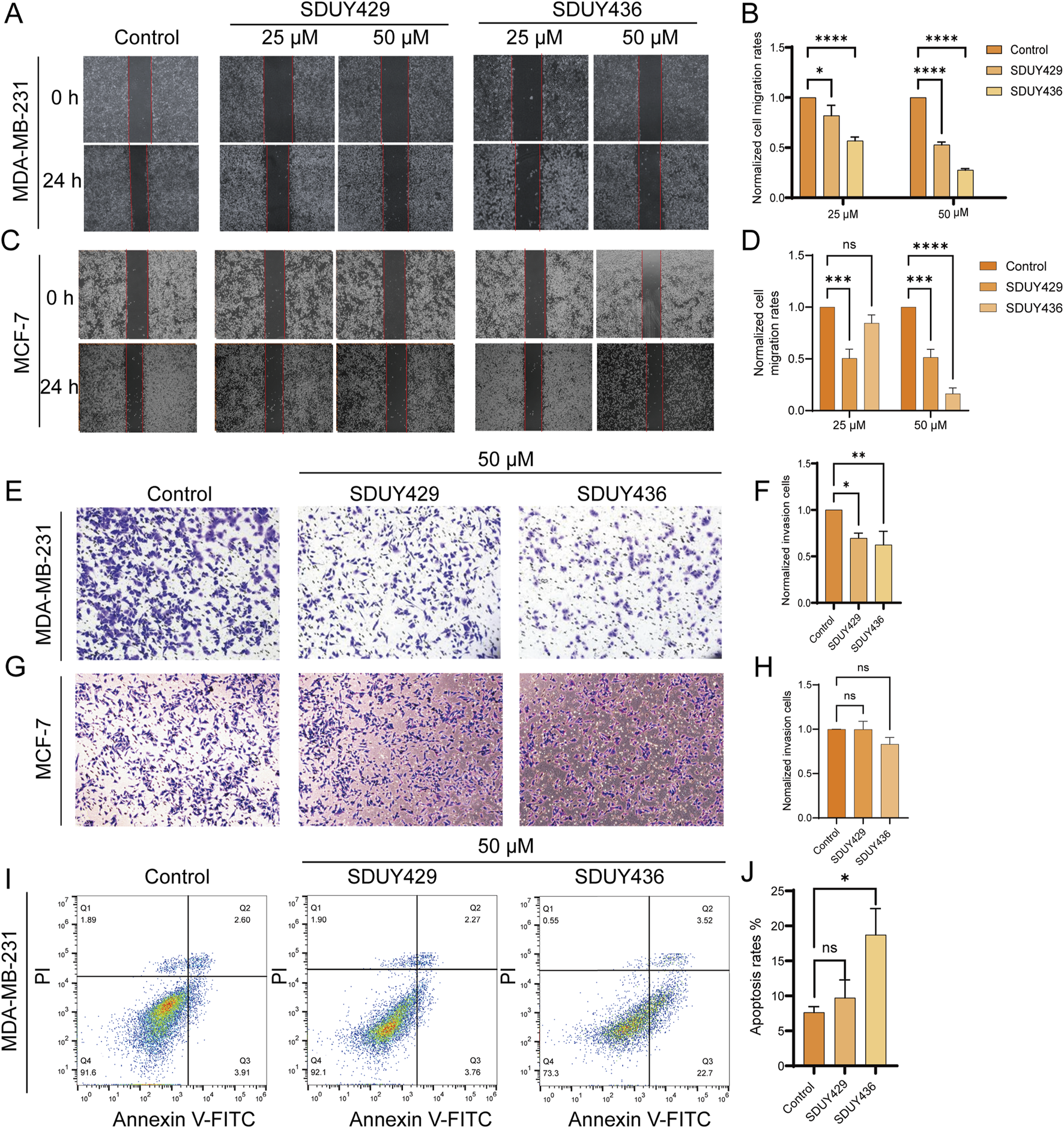 Impacts of hERG activators on the migration, invasion and apoptosis of breast cancer cells. (A) Wound healing experiments were conducted to assess the effects of varying concentrations (25 and 50 μM) of SDUY429 and SDUY436 on the motility of MDA-MB-231 cells with initial and final images captured at 0 and 24 h post-treatment; (B) Quantification of relative migration rates of MDA-MB-231 cells normalized to the control group following treatment with SDUY429 and SDUY436; (C) Wound healing experiments were conducted to assess the effects of varying concentrations (25 and 50 μM) of SDUY429 and SDUY436 on the motility of MCF-7 cells with initial and final images captured at 0 and 24 h post-treatment; (D) Quantification of relative migration rates of MCF-7 cells normalized to the control group following treatment with SDUY429 and SDUY436; (E) Transwell invasion assays were performed to evaluate the invasive capacity of MDA-MB-231 cells after a 24-h exposure to 50 µM SDUY429 and SDUY436; (F) Quantification of the relative invasive cell numbers in MDA-MB-231 cells normalized to the control group; (G) Transwell invasion assays were performed to evaluate the invasive capacity of MCF-7 cells after a 24-h exposure to 50 µM SDUY429 and SDUY436; (H) Quantification of the relative invasive cell numbers in MCF-7 cells normalized to the control group; (I) Apoptosis assay in MDA-MB-231 cells treated with 50 µM SDUY429 or SDUY436 for 24 h. The distributions of cell population in live (Q4), early apoptosis (Q3), late apoptosis (Q2) and dead cell subpopulations (Q1) are indicated; (J) Statistical data of apoptosis rates calculated as the sum of the early and late apoptotic cells. All data are presented as mean ± SEM from three independent experiments. Statistical significance is denoted as follows: *p < 0.05; **p < 0.01; ***p < 0.001, ****p < 0.0001 versus the control group, ns = not significant.