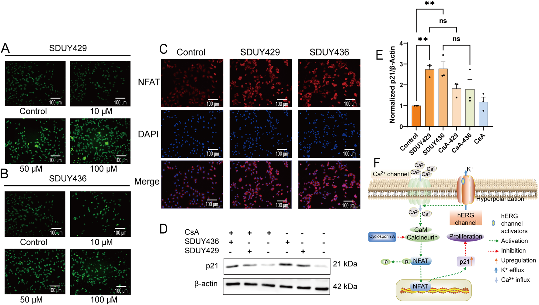 Mechanistic insights into the anti-proliferative effects of SDUY429 and SDUY436 on MDA-MB-231 cells. (A) Intracellular Ca2+ levels were measured in terms of relative fluorescence using the Fluo-4 AM probe, revealing a concentration-dependent increase in calcium levels upon treatment with SDUY429. Scale bars, 100 μm; (B) Intracellular Ca2+ levels were measured in terms of relative fluorescence using the Fluo-4 AM probe, revealing a concentration-dependent increase in calcium levels upon treatment with SDUY436. Scale bars, 100 μm; (C) Quantitative assessment of NFAT nuclear expression in MDA-MB-231 cells via immunofluorescence staining after a 24-h treatment with 50 μM SDUY429 or SDUY436. Scale bar, 100 μm; (D) Western blotting analysis of p21 protein expression under various conditions: treatment with 10 μM CsA, 50 μM SDUY429 or SDUY436 alone, and a combination of 10 μM CsA with 50 μM SDUY429 or SDUY436; (E) Quantification of relative p21 protein expression normalized to the control group; (F) Schematic representation of the anti-proliferative signaling pathways involving the hERG channel activation and the NFAT/p21 axis. All data are presented as mean ± SEM from at least three independent experiments. Statistical significance is indicated as follows: *p < 0.05; **p < 0.01; ***p < 0.001, ****p < 0.0001 versus the control group, ns = not significant.