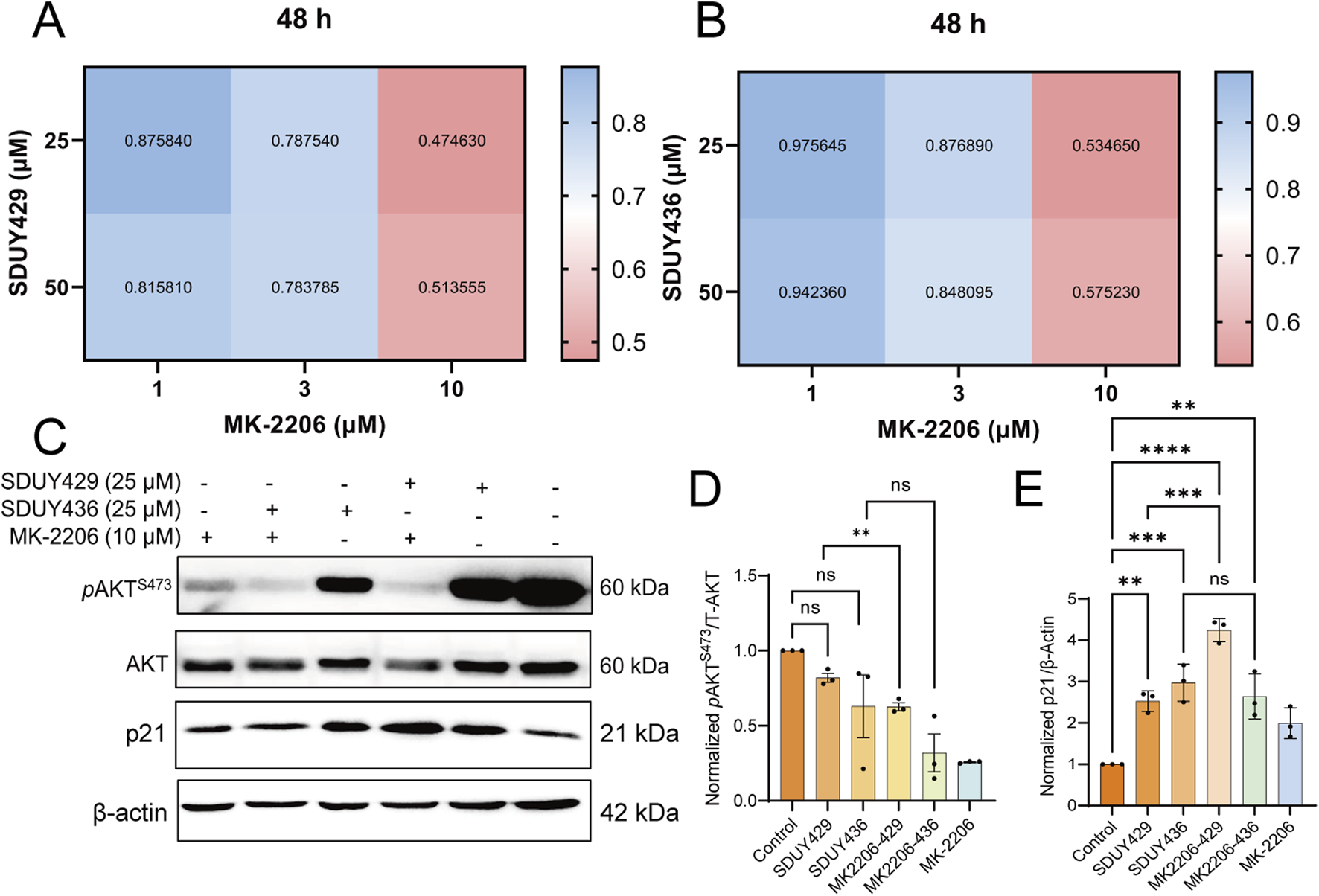 Synergistic effects of MK-2206 on the anti-proliferative activity of SDUY429 and SDUY436 in MDA-MB-231 cells. (A) A matrix of drug combinations was utilized to assess the synergistic effects between SDUY429 and MK-2206 on MDA-MB-231 cell viability after 48 h, with CI values indicating the level of synergy; (B) A matrix of drug combinations was utilized to assess the synergistic effects between SDUY436 and MK-2206 on MDA-MB-231 cell viability after 48 h with CI values indicating the level of synergy; (C) The expression levels of the pAKTS473 and p21 proteins were evaluated by Western blotting under various conditions: treatment with 10 μM MK-2206, 25 μM SDUY429 or SDUY436 alone, and a combination of 10 μM MK-2206 with 25 μM SDUY429 or SDUY436 for 48 h; (D) Quantification of the relative pAKTS473 protein expression normalized to the control group; (E) Quantification of the relative p21 protein expression normalized to the control group. All data are presented as mean ± SEM from at least three independent experiments. Statistical significance is indicated as follows: *p < 0.05; **p < 0.01; ***p < 0.001, ****p < 0.0001 versus the control group, ns = not significant.