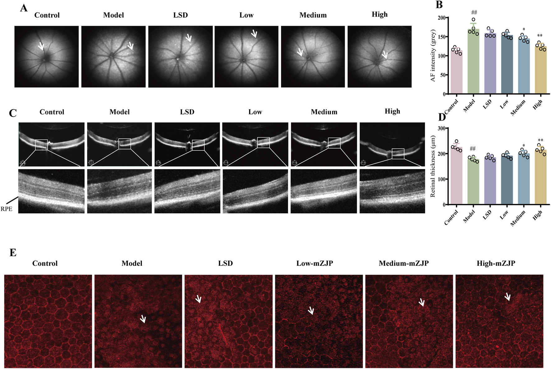 mZJP alleviated the retinal pathological changes in model mice. (A) Representative images of FAF. The white arrow points to the hyperfluorescence spots. (B) AF intensity to estimate the amounts of lipofuscin. LSD: positive drug control group. Mean ± SD, n = 5 mice per group, ##p < 0.01; compared with the model group, *p < 0.05 and **p < 0.01. (C) Representative images of OCT. The black line points to the retinal pigment epithelium layer. (D) Retinal thickness to evaluate the effect of mZJP. Mean ± SD, n = 5 mice per group. ##P < 0.01; compared with the model group, *p < 0.05 and **p < 0.01. (E) Immunofluorescence staining of ZO-1 on RPE/choroidal flat mounts. The white arrow points to the typical pathological changes. The images displayed are representative of the results from all mice in the same group (200×).