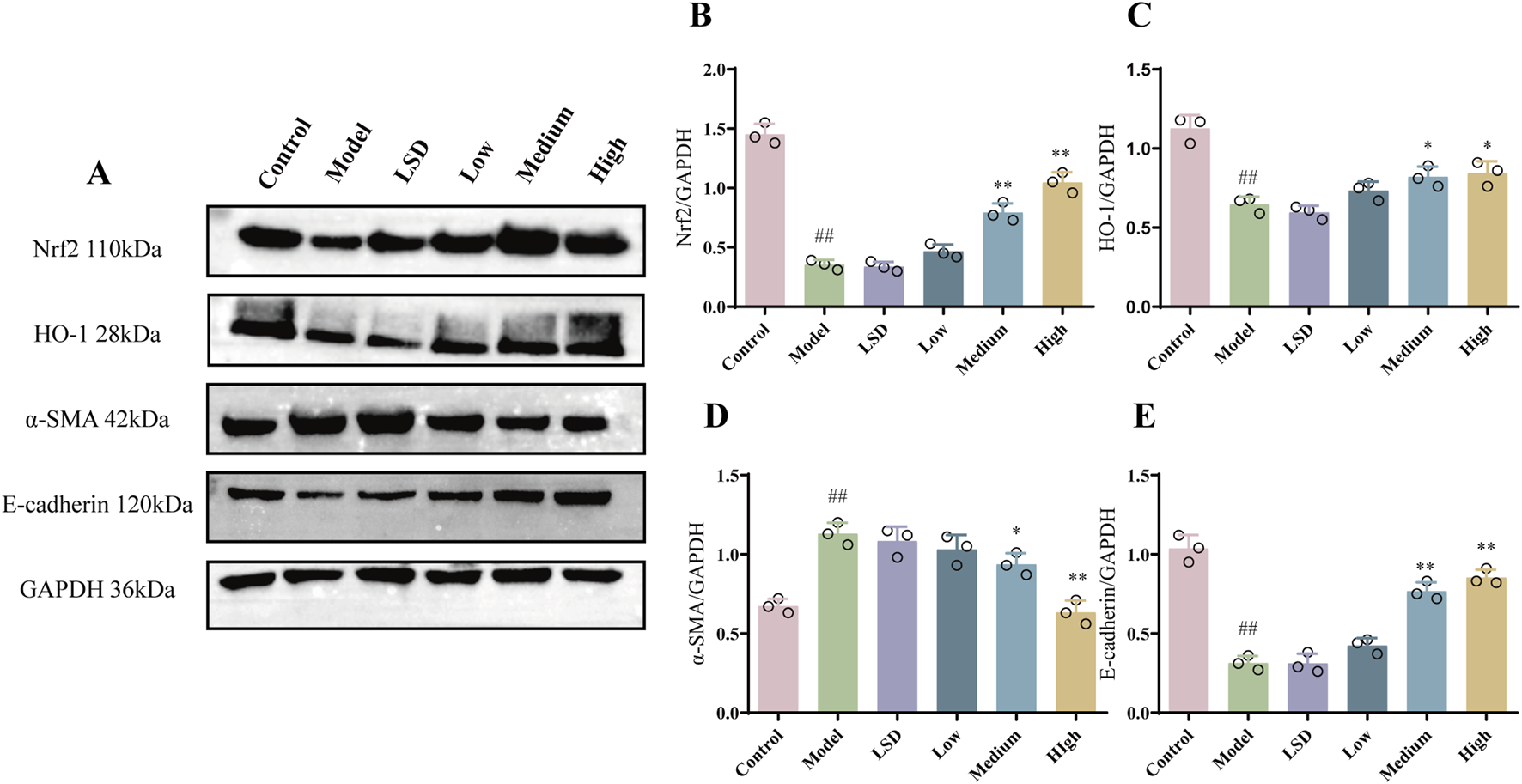 mZJP suppressed EMT and activated the Nrf2 pathway in model mice. (A–E) Protein levels of Nrf2, HO-1, α-SMA, and E-cadherin. GAPDH: internal control. Mean ± SD, n = 3 mice per group. Compared with the control group, ##p < 0.01; compared with the model group, *p < 0.05 and **p < 0.01.