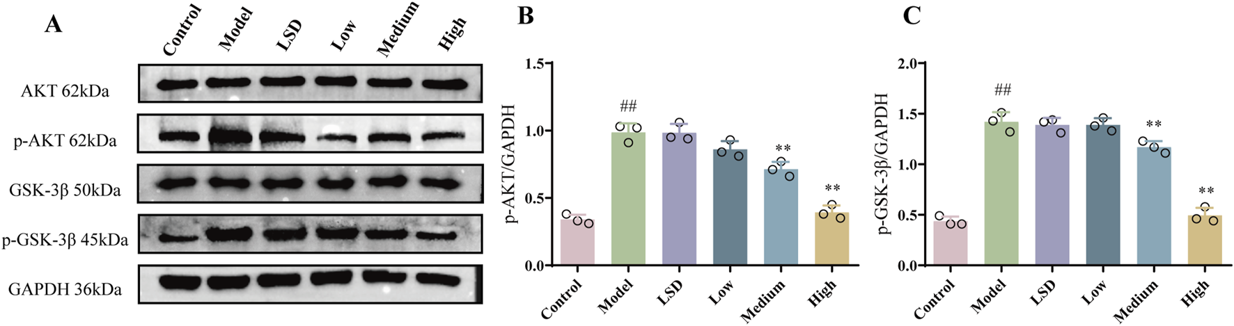 mZJP inhibited the Akt/GSK-3β pathway in model mice. (A–C) Protein expression of Akt, p-Akt, GSK-3β, and p-GSK-3β. In B and C, mean ± SD, n = 3 mice per group. Compared with the control group, ##p < 0.01; compared with the model group, **p < 0.01.