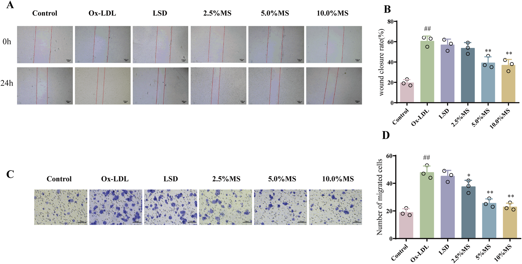 Cells were incubated until 80%–90% confluence in a 6-well plate. A straight-line scratch was made by a pipette tip. After rinsing with PBS, the cells were treated in the absence or presence of mZJP (2.5%, 5%, and 10%) and OxLDL for 24 h. Microscope images were taken of the wound after 0 and 24 h. Ultimately, the migratory capacity was assessed by means of the wound healing ratio.