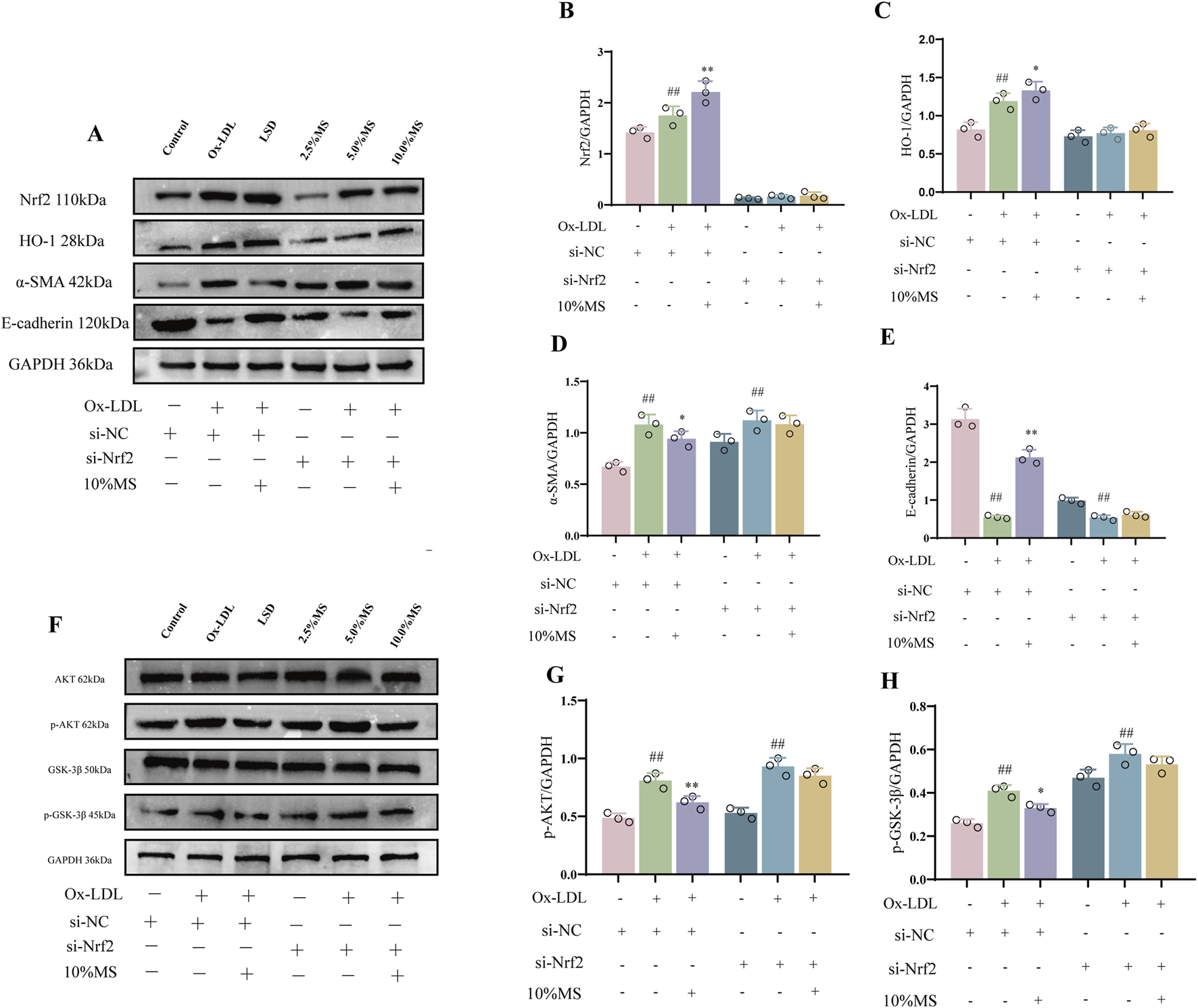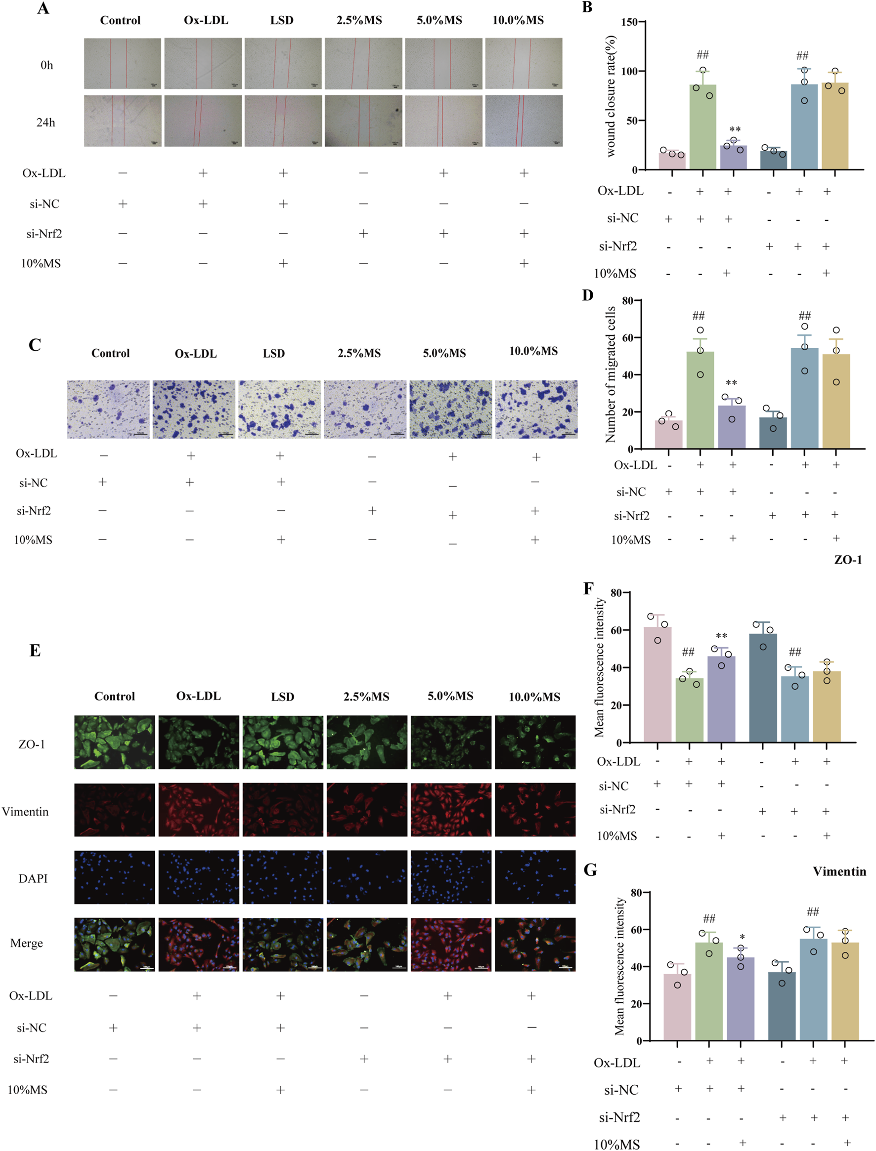 mZJP-attenuated OxLDL-induced EMT is associated with Akt/GSK3β-mediated Nrf2 activation (1). ARPE-19 cells were transfected with NC-siRNA or Nrf2-siRNA sequences, incubated with/without 10% mZJP for 24 h, and stimulated with OxLDL for 24 h (A, B). Images of wound healing assay for ARPE-19 cell migration in the six groups were captured at 0 h and after 24 h (40×). Wound closure was measured at 24 h after scratching. Mean ± SD, n = 3. Compared with the control group, ##p < 0.01; compared with the model group, **P < 0.01. (C, D) Transwell assay under Nrf2 silenced condition (200×). It was visualized using graph. Mean ± SD, n = 3. Compared with the control group, ##p < 0.01; compared with the model group, **p < 0.01. (E–G) Immunofluorescence staining of ZO-1 (green) and vimentin (red) was detected by fluorescence microscopy. ImageJ software was used to analyze the fluorescence intensity of ZO-1 and vimentin (200×). MS: mZJP. Mean ± SD, n = 3. Compared with the control group, ##p < 0.01; compared with the model group, **p < 0.01.