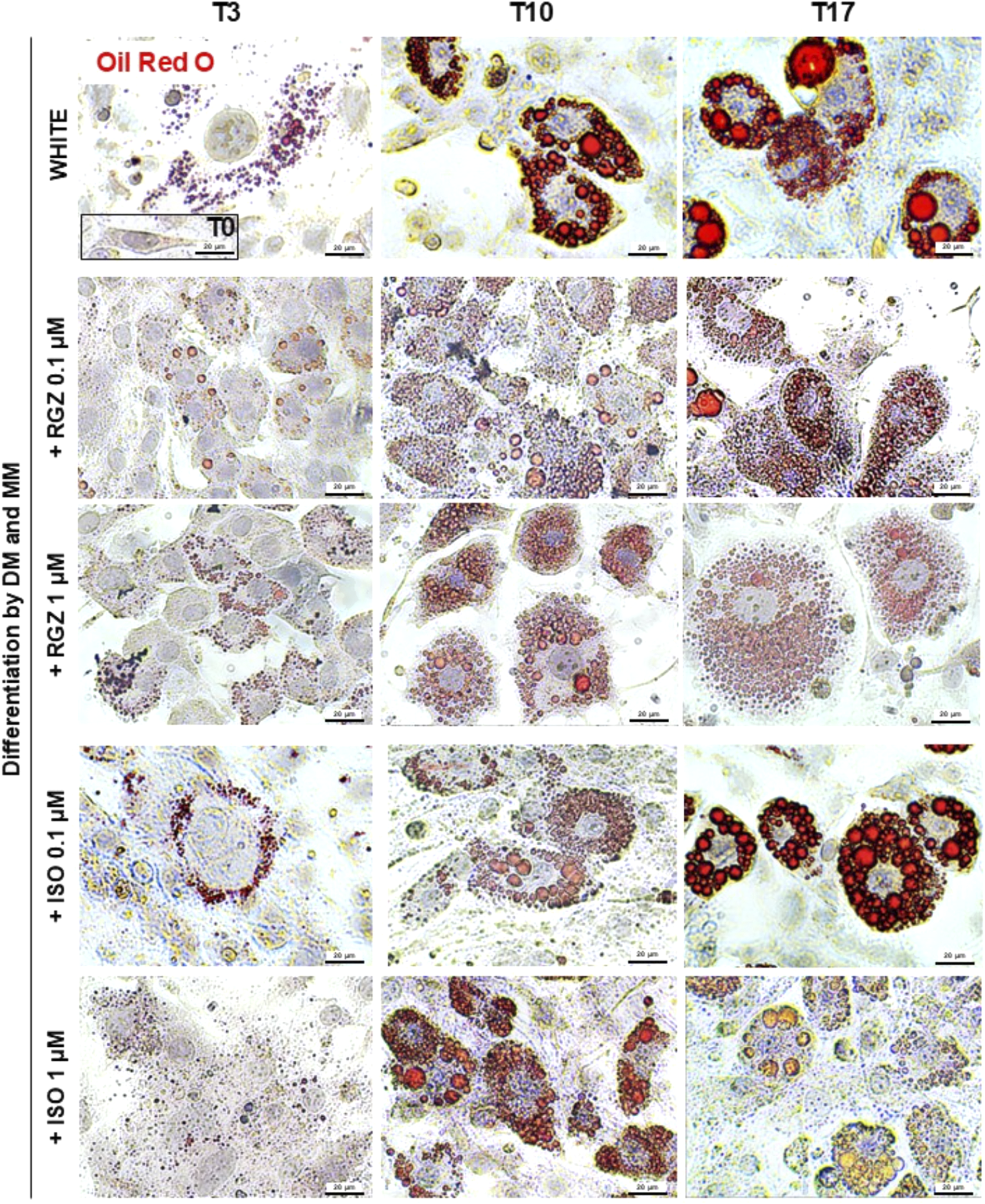 Figure 2. Representative images of ORO staining in preadipocytes (T0) and adipocytes differentiated at T3, T10, and T17 following treatment with DM and MM without or with RGZ 0.1 µM and 1 μM and ISO 0.1 µM and 1 µM. For each group and each time point, the cells contained in 10 fields acquired at ×40 magnification for image analysis of Oil Red O expression have been analyzed. Scale bar: 20 µm. Abbreviations: DM, differentiation medium; MM, maintenance medium; ISO, isoproterenol; RGZ, rosiglitazone; ORO, Oil Red O.