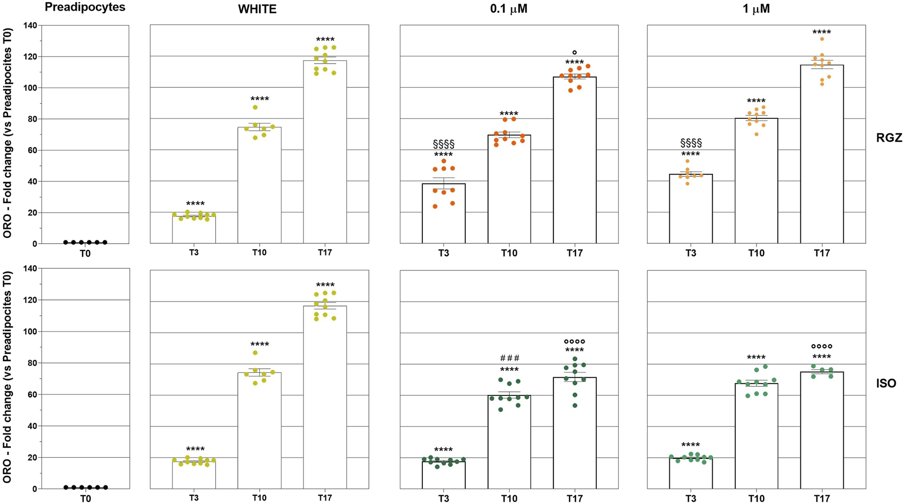 Figure 3. Quantitative analysis of lipidic deposits. Column graphs display the fold changes of the ORO staining expressed in percentage of positive pixels (PPP) ± SEM: statistical significance of adipocytes differentiated at T3, T10, and T17 following treatment with DM and MM (WHITE), RGZ 0.1 µM and 1 µM, or ISO 0.1 µM and ISO 1 µM versus T0 (****p < 0.0001). The graph also reports the statistical analysis of RGZ 0.1 μM T3 and RGZ 1 μM T3 versus WHITE T3 (§§§§p < 0.0001); ISO 0.1 μM T10 versus WHITE T10 (###p < 0.001); RGZ 0.1 µM T17, ISO 0.1 μM T17, and ISO 1 μM T17 versus WHITE T17 (°p < 0.05; °p < 0.0001). Abbreviations: ISO, isoproterenol; RGZ, rosiglitazone; ORO, Oil Red O.