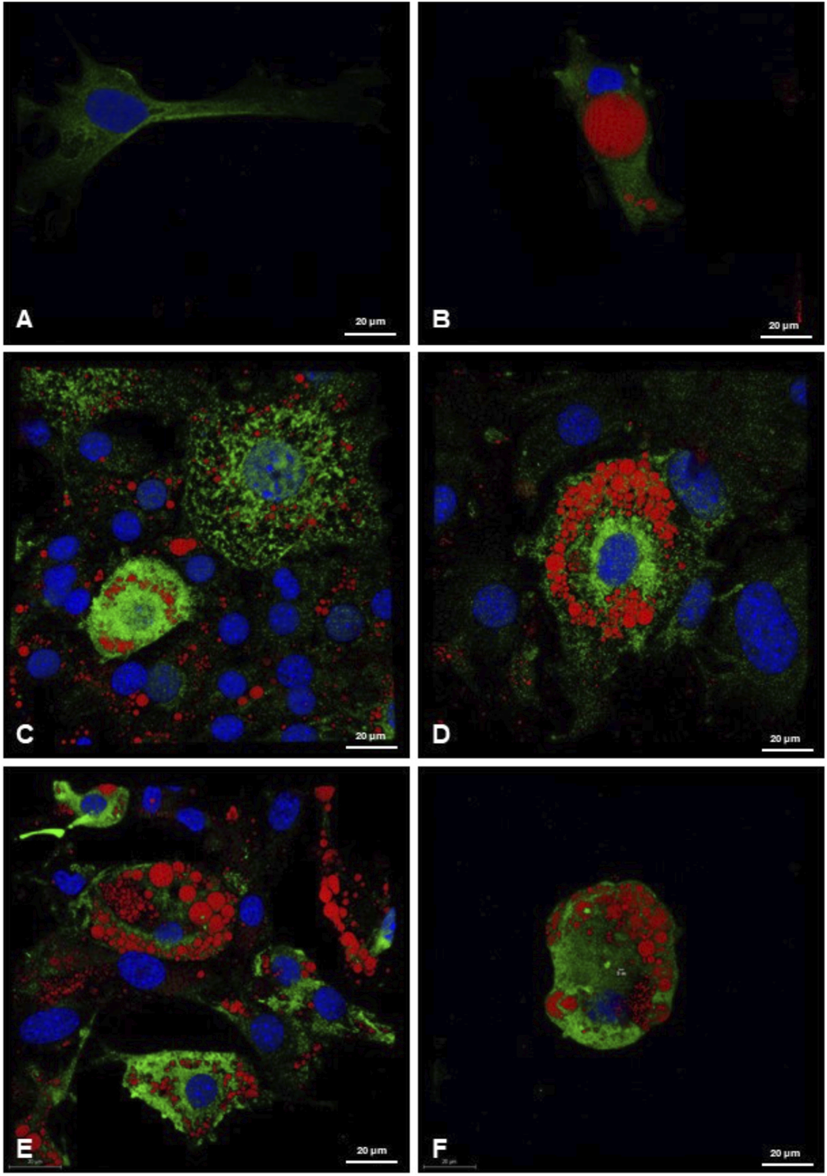 T0 represents the preadipocyte stage after reaching a condition of over-confluence necessary for replicative arrest and the triggering of the differentiation process. This step revealed elongated cells and intracellular lipid deposits, confirming a preadipocyte phenotype.