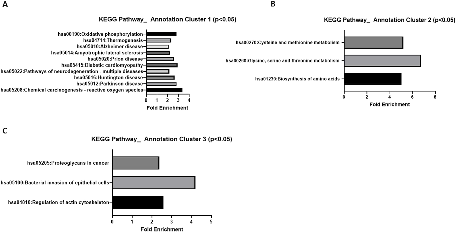 KEGG analysis of LC-MC proteomic results. Significant (p < 0.05) pathway fold enrichment in annotation cluster (A) 1 (B) 2, and (C) 3 of differentially expressed proteins in OVCAR8 cells treated with LDN-57444 relative to DMSO control.