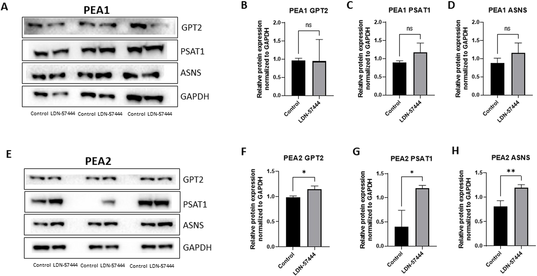 Validation of enriched proteins identified by proteomic analysis in PEA1 and PEA2 cells. Western blot analysis of (A) GPT2, PSAT1, and ASNS with respective GAPDH loading controls in PEA1 cells treated with either 10 µM of LDN-57444 or DMSO control for 48 h. Relative band densities of (B) GPT2, (C) PSAT1, and (D) ASNS normalized to GAPDH. Western blot analysis of (E) GPT2, PSAT1, and ASNS with respective GAPDH loading controls in PEA2 cells treated with either 5 µM of LDN-57444 or DMSO control. Relative band densities of (F) GPT2, (G) PSAT1, and (H) ASNS normalized to GAPDH. Error bars represent standard deviation of 3 biological replicated. *p < 0.05, **p < 0.005, as indicated. ns, non-significant.