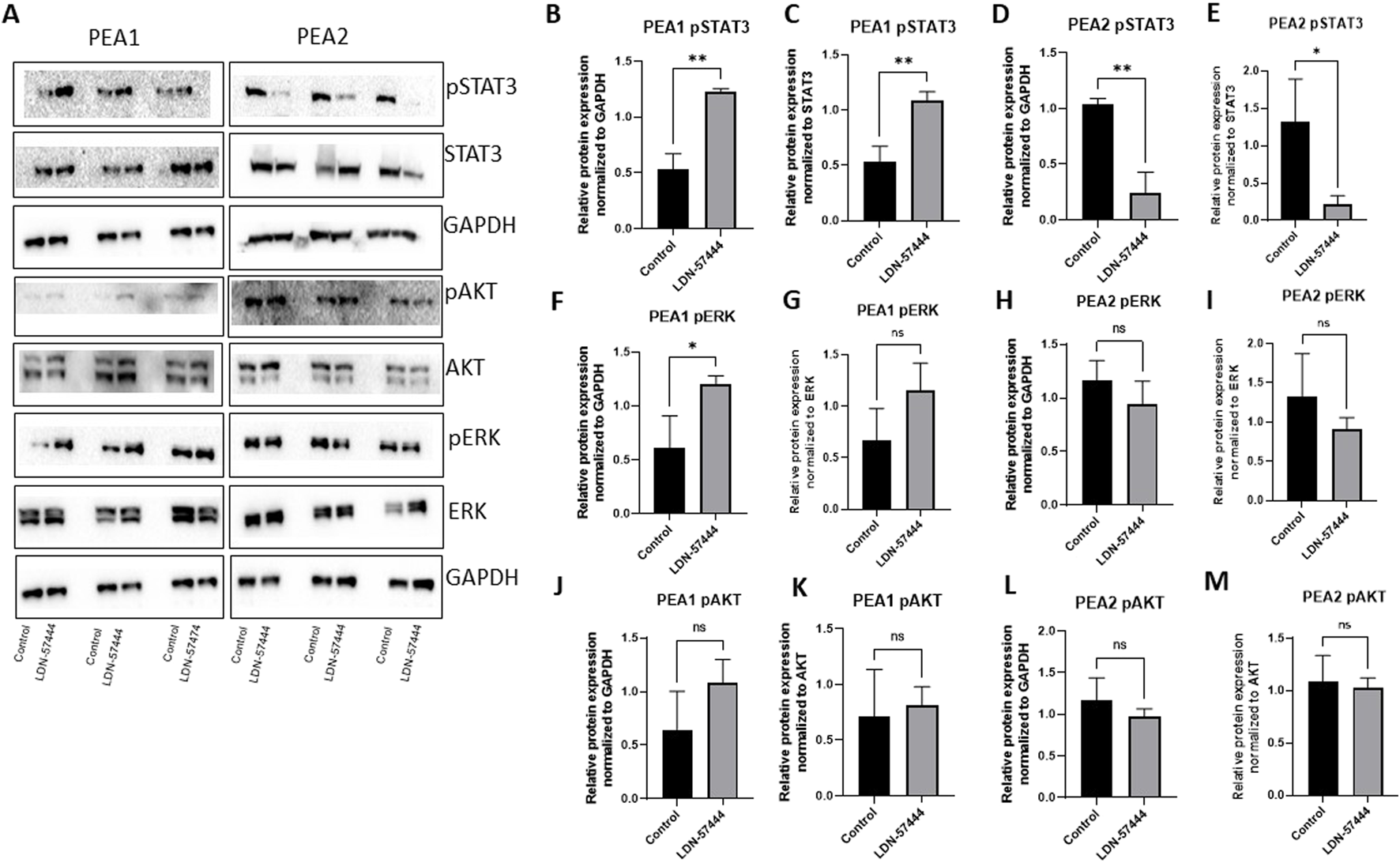 Cell growth pathway changes in PEA1 and PEA2 in response to UCHL1 small molecule inhibition (A) pSTAT3/STAT3, pAKT/AKT, and pERK/ERK with respective GAPDH loading controls in PEA1 and PEA2 cells treated with LDN-57444 (10 µ PEA1, 5 µM, PEA2) or DMSO control. Relative band densities of pSTAT3 in PEA1 normalized to (B) GAPDH and (C) total STAT3. PEA2 pSTAT3 levels normalized to (D) GAPDH and (E) total STAT3. PEA1 pERK levels normalized to (F) GAPDH and (G) total ERK. PEA2 pERK levels normalized to (H) GAPDH and (I) total ERK. PEA1 pAKT levels normalized to (J) GAPDH and (K) total ERK. PEA2 pAKT levels normalized to (L) GAPDH and (M) total AKT. Error bars represent standard deviation of 3 biological replicated. *p < 0.05, **p < 0.005, as indicated. ns, non-significant.