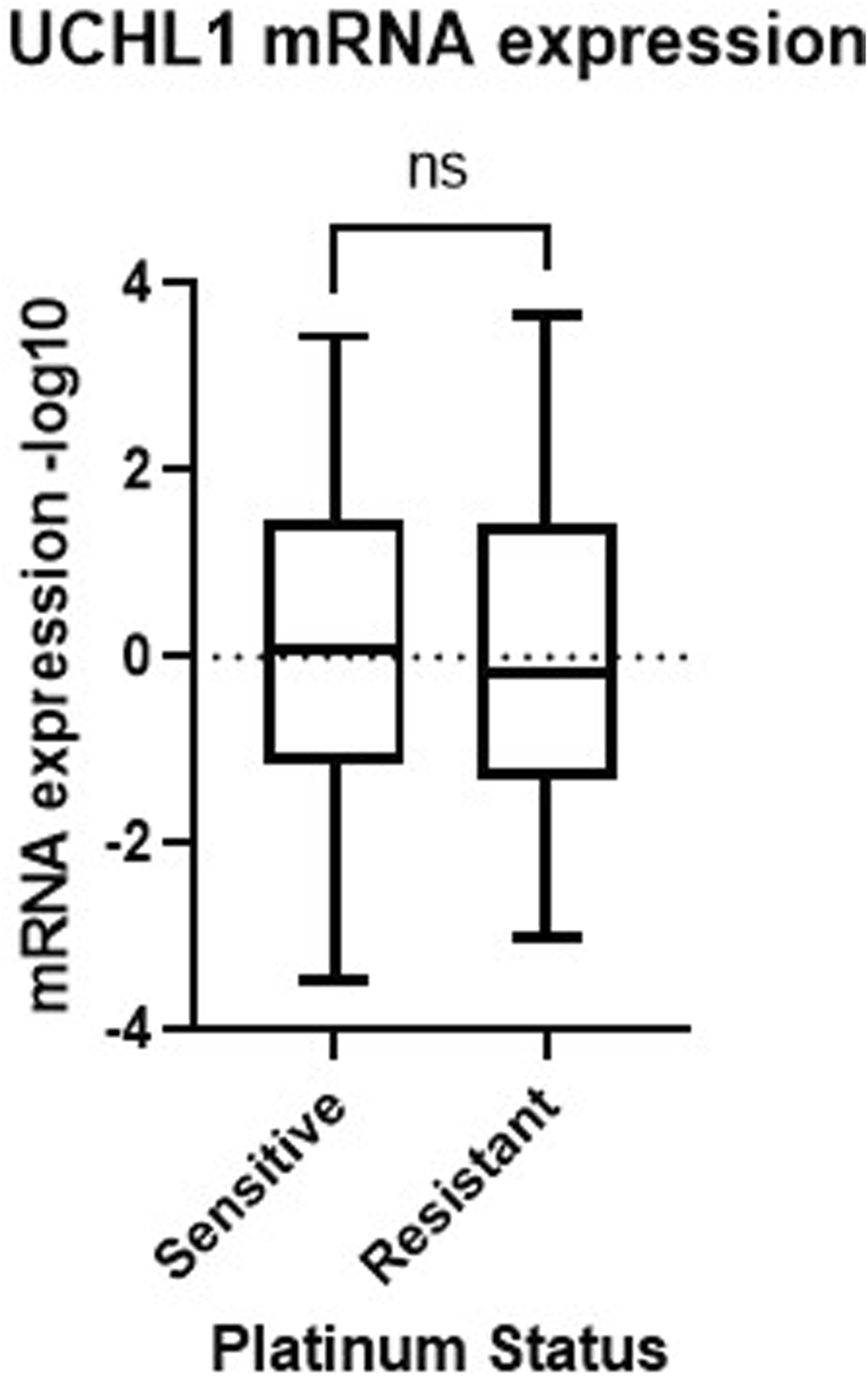 UCHL1 expression in serous ovarian cancer patient tumors. UCHL1 mRNA expression (−log10) in patient platinum sensitive (n = 197) and resistant (n = 90) tumors obtained from the TCGA Nature 2011 cohort. TCGA, The Cancer Genome Atlas; ns, non-significant.