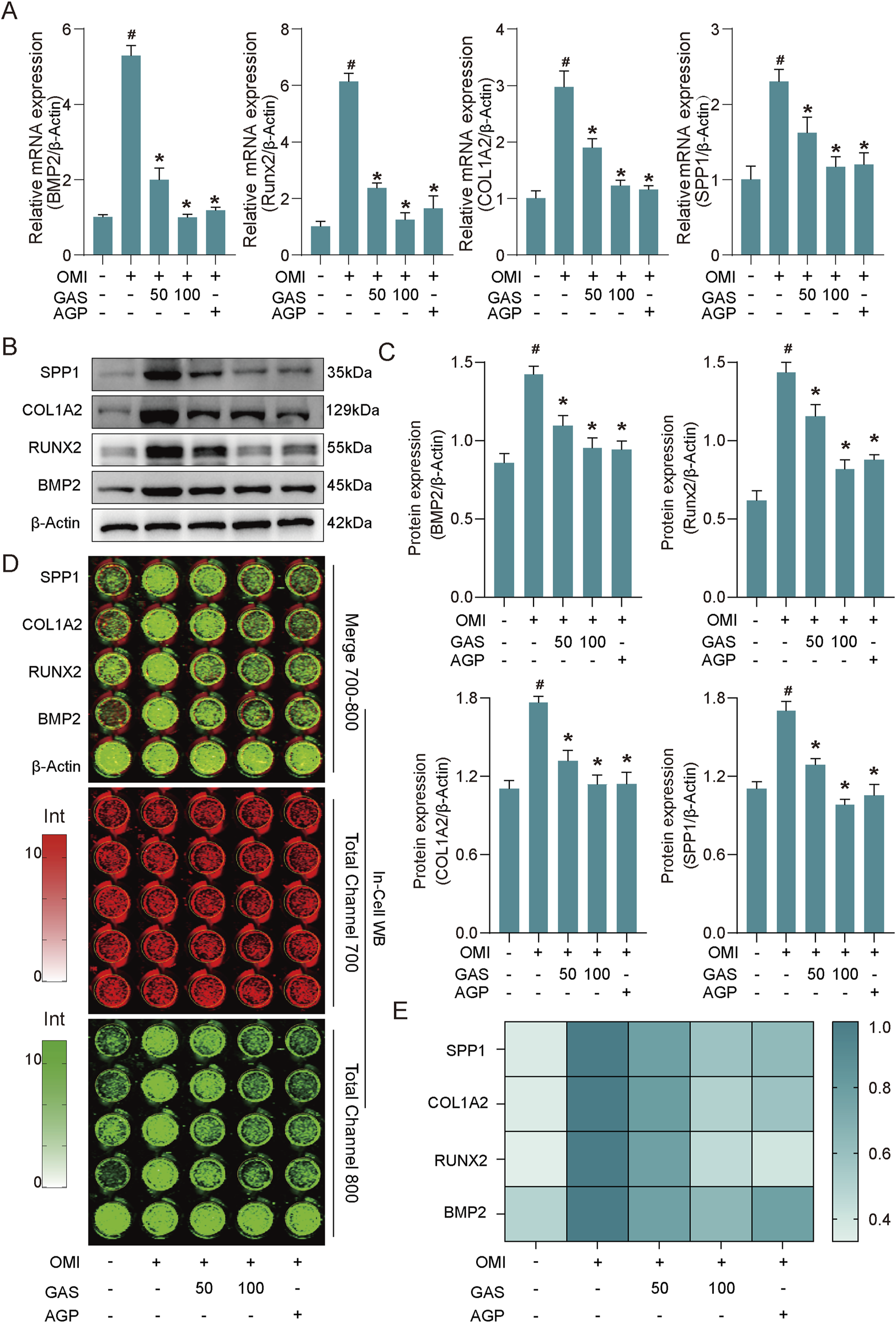 GAS inhibits the expression of osteogenesis-specific markers induced by OM. (A) RT-qPCR results show that GAS can significantly inhibit the expression of specific markers of osteogenesis in OM-induced VICs (OMI, OM-induced VICs group; GAS 50 μM treatment group; GAS 100 μM treatment group; AGP 10 μM treatment group) (n = 3). (B) Western blot results show that GAS can significantly inhibit the expression of specific markers of osteogenesis in OM-induced VICs (n = 3); (C) Semi-quantitative statistics of the band thickness of the Western blot results in B; (D) In-cell Western blot results show GAS can significantly inhibit the expression of osteogenic specific markers in OM-induced VICs (n = 3); (E) Semi-quantitative statistics of the intensity of In-cell blotting results in (D) Statistical significance is indicated by # for OMI group vs control group and * for GAS or AGP group vs OMI group (p ≤ 0.05).