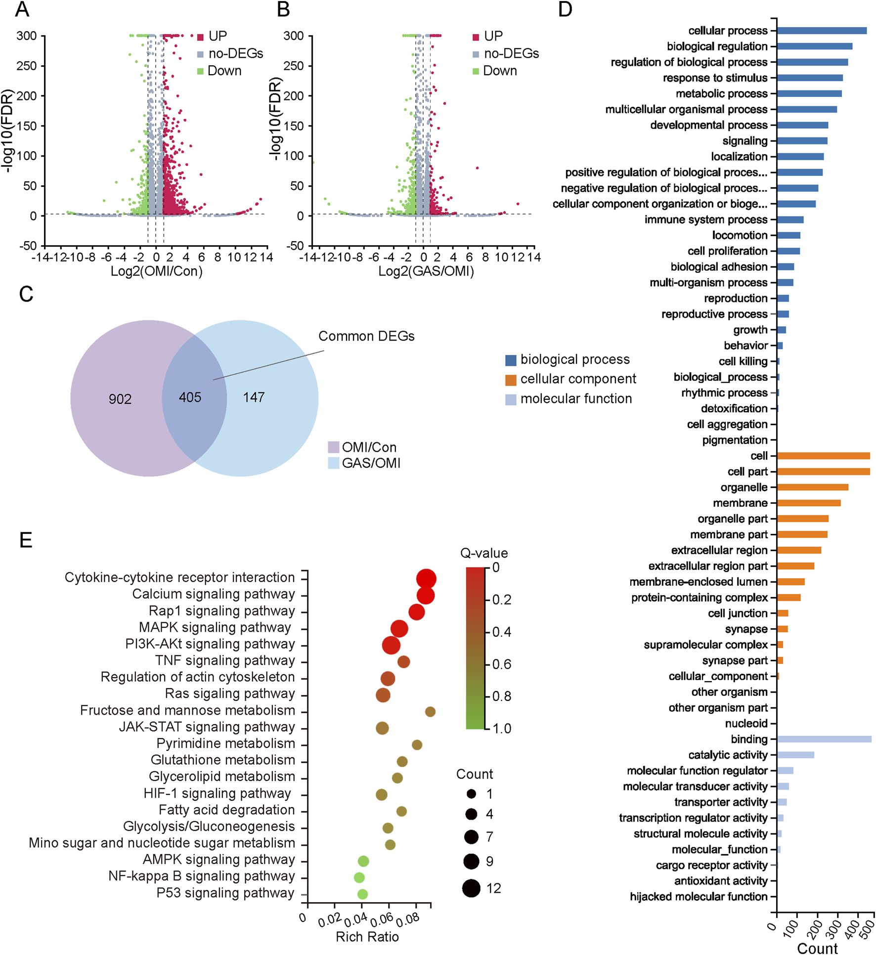 Gene expression profiles of mRNA sequencing with gastrodin (GAS) treatment under the condition of osteogenic medium induction (OMI). (A,B) Volcano map of differentially expressed genes (DEGs) in OMI versus control (OMI/Con), upregulation: 823 and downregulation: 484; in GAS versus OMI (GAS/OMI), upregulation: 247 and downregulation: 305, |log2 (fold change) (FC)| > 1 and false discovery rate (FDR) < 0.001 was considered as DEGs; (C) Venn interaction of DEGs of OMI/Con and GAS/OMI; (D) GO enrichment of the common DEGs including biological process, cellular component and molecular function; (E) KEGG pathway enrichment; a lower Q value indicates a higher degree of enrichment.