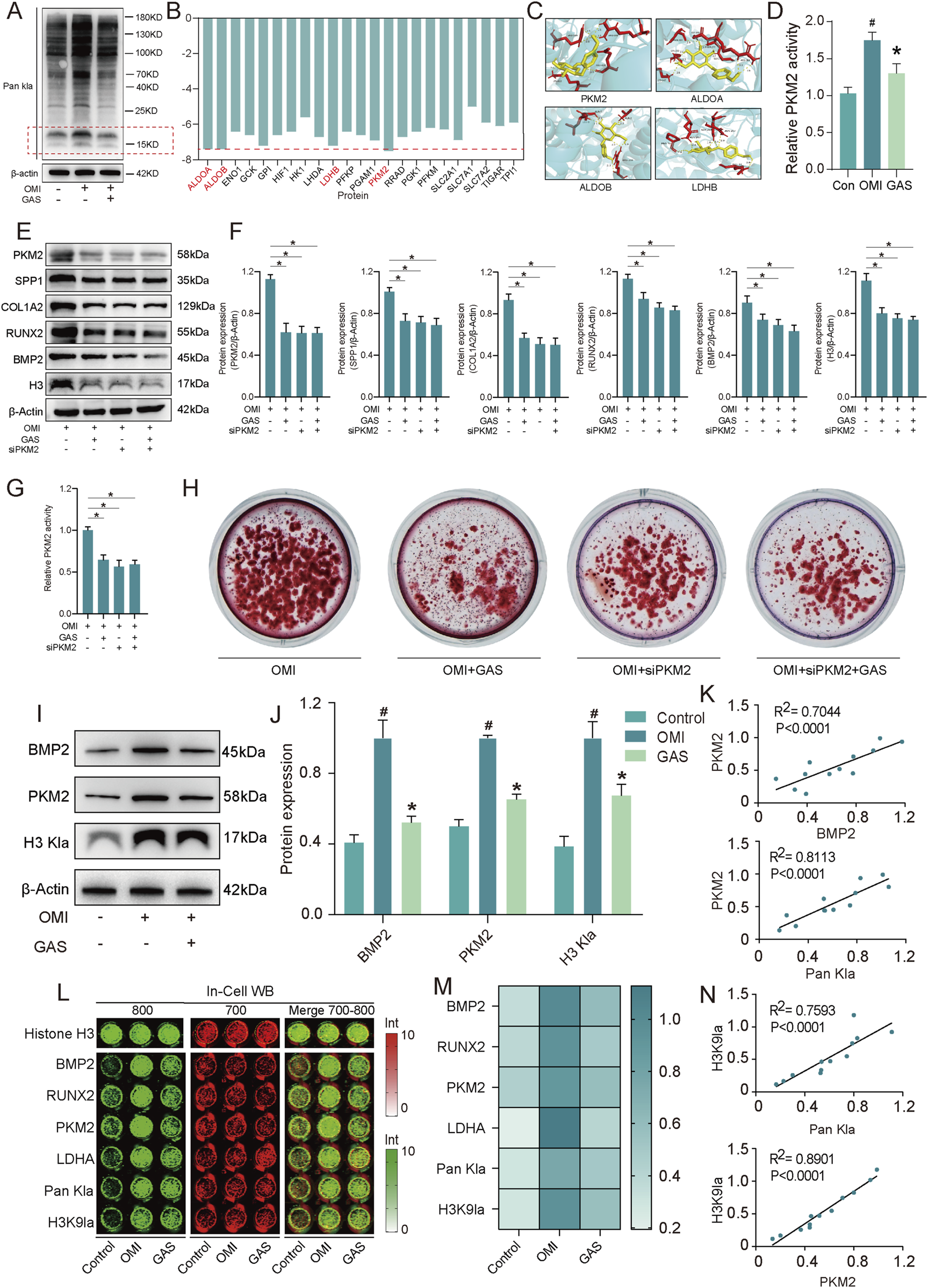 Gastrodin inhibits VICs calcification via H3 histone lactylation by interfering with PKM2. (A) Pan Kla expression levels of VICs with osteogenic medium (OM) and OM plus gastrodin (GAS) treatments (n = 3); (B) The binding energy of gastrodin and corelating proteins; (C) Molecular docking of gastrodin and the proteins with 4 least binding energy PKM2, ALDOA, ALDOB, LDHB; (D) Enzyme activity of PKM2 in VICs treated with gastrodin and untreated with gastrodin protein under OM induction (n = 3); (E,F) Expression levels of PKM2, SPP1, COL1A2, RUNX2, BMP2 and H3 Kla of VICs under OM inducing with gastrodin and siPKM2 treating (n = 3); (G) Enzyme activity of PKM2 in VICs under OM inducing with gastrodin and siPKM2 treating (n = 3); (H) Alizarin Red staining in VICs under OM inducing with gastrodin and siPKM2 treating (n = 3); (I,J) Expression levels of BMP2, PKM2 and H3 Kla of VICs under OM inducing with and without gastrodin treating (n = 3); (K) Correlation analysis of the expression data above; (L,M) In-cell Western blotting of BMP2, RUNX2, PKM2, LDHA, H3K9la of VICs under OM inducing with and without gastrodin treating, Histone H3 (n = 3); (N) Correlation analysis of the expression data above. #p ≤ 0.05 in OMI vs Control, *p ≤ 0.05 in GAS-treated vs OMI.