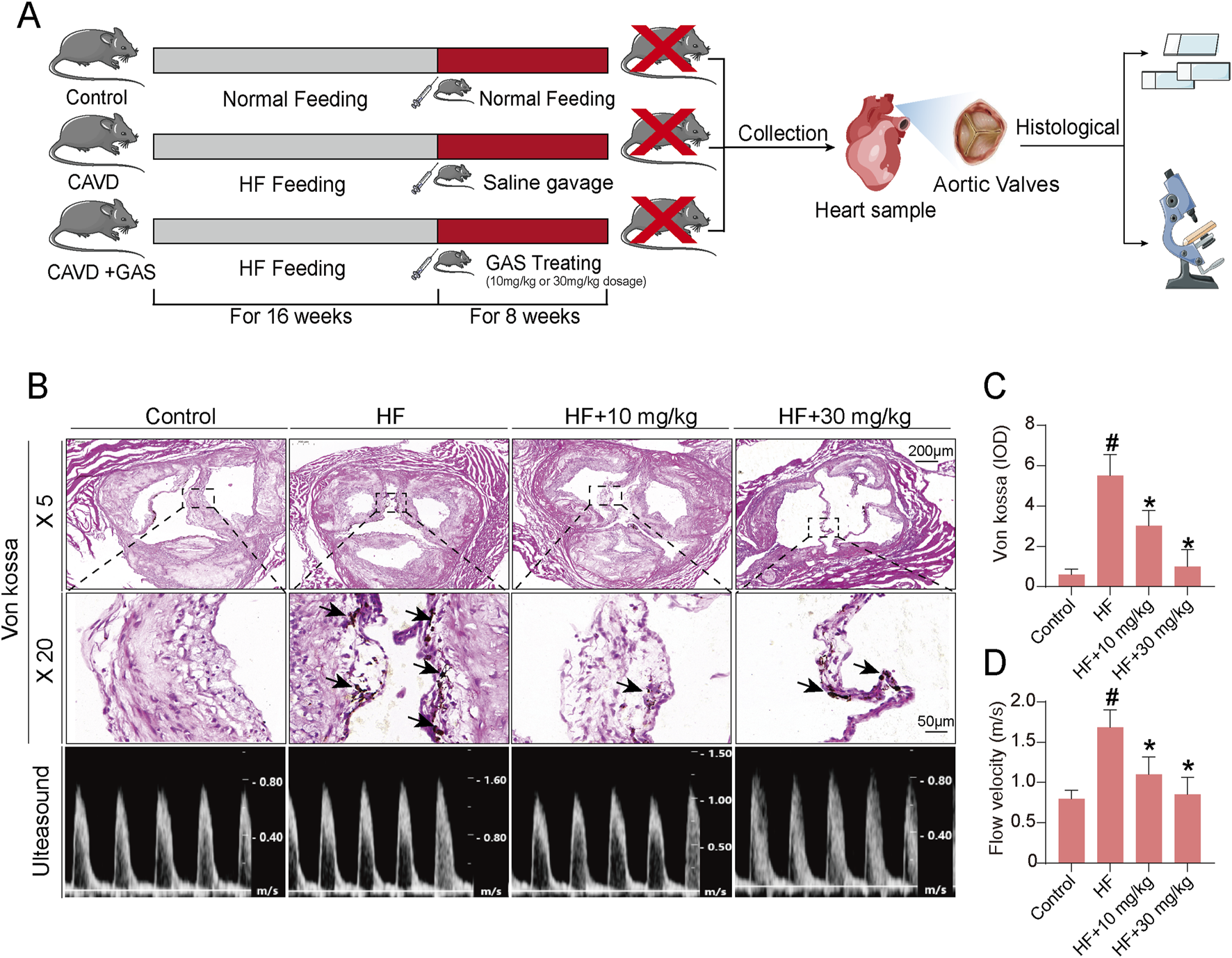 All animal experiments involved in this study were approved by the Ethics Committee of Hubei University of Chinese Medicine (Approval No. 20220827009). 18 three-week-old ApoE−/−deficient SPF-grade mice were purchased from Huazhong University of Science and Technology (Animal License No. SCXK (E) 2021-0009 and No. SYXK (E) 2021-0057). The ApoE−/− mice were divided equally into 3 groups of 6 mice each. To induce aortic valve calcification, mice were fed a high-fat diet (containing 42% fat and 0.25% cholesterol) for 16 consecutive weeks. Subsequently, from the 17th week, mice were fed a normal diet (control group), high-fat diet (CAVD group), or a high-fat diet supplemented with 10 mg/kg and 30 mg/kg gastrodin (GAS treatment group) for 8 consecutive weeks. Then, the mice were sacrificed, and their heart valves were collected for histological sectioning and Von Kossa staining. The staining results were semi-quantitatively analyzed using ImageJ software. Small animal cardiac ultrasound was used to evaluate flow velocity around the aortic valve.