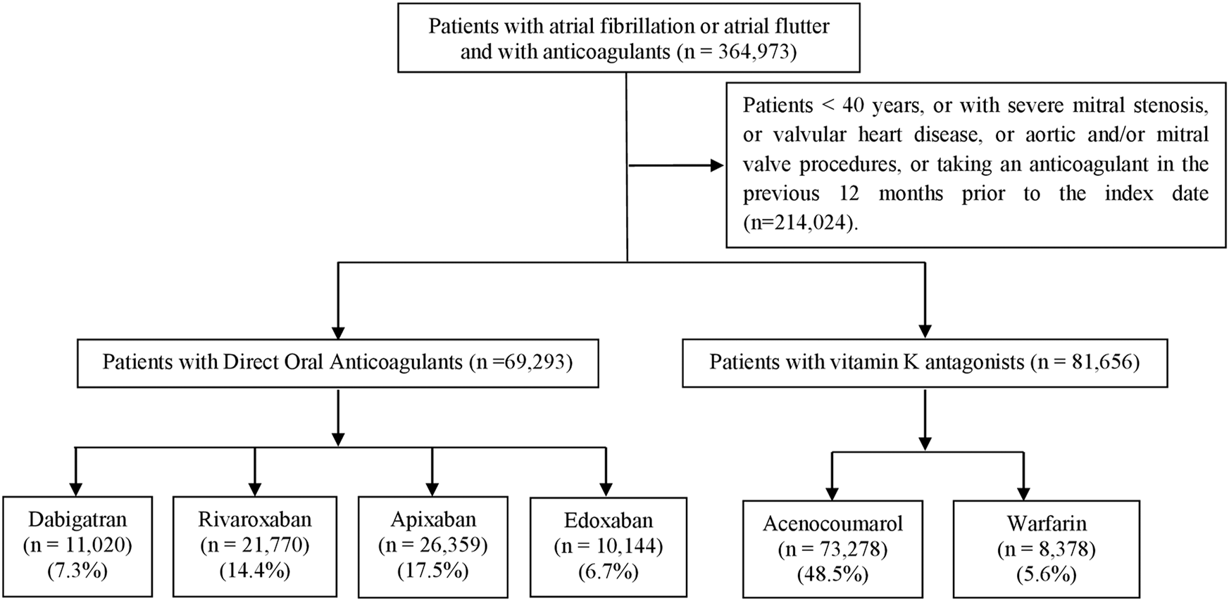 The main aim of this study was to evaluate the effectiveness (ischaemic/transient stroke, systemic/pulmonary embolism and mortality) and safety (gastrointestinal and intracranial bleeding) of DOACs (dabigatran, rivaroxaban, apixaban and edoxaban) and warfarin versus acenocoumarol in a large population cohort under real-world clinical practice conditions with 8 years of follow-up.