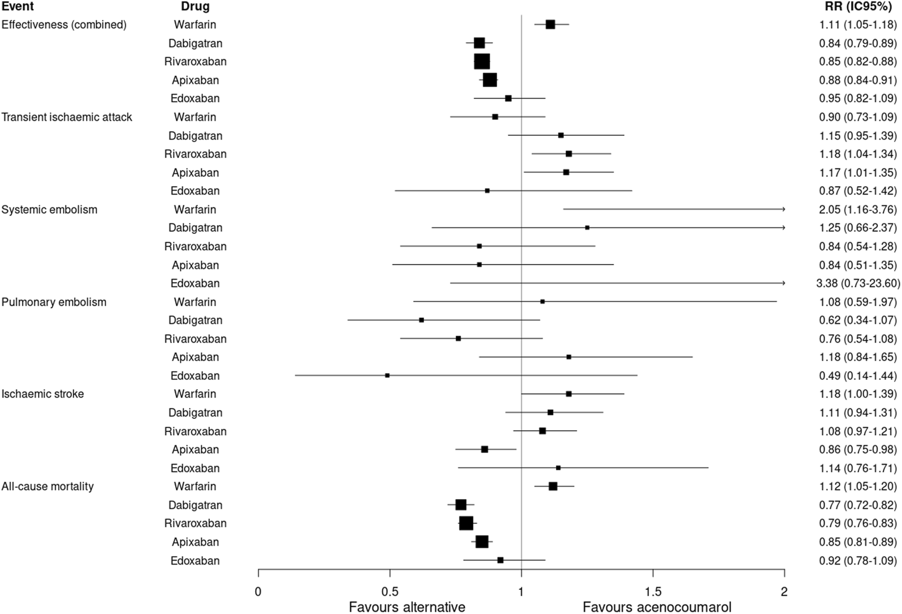 An analysis of specfic event types in this study revealed an increased risk of TIA with rivaroxaban (RR: 1.18; 95%CI 1.04–1.34) and apixaban (RR: 1.17; 95%CI 1.01–1.35), and a lower risk of ischaemic stroke with apixaban (RR: 0.86; 95%CI 0.75–0.98) compared to acenocoumarol. Warfarin was less effective than acenocoumarol in preventing systemic embolism (RR: 2.05; 95%CI 1.16–3.76) (Table 3).