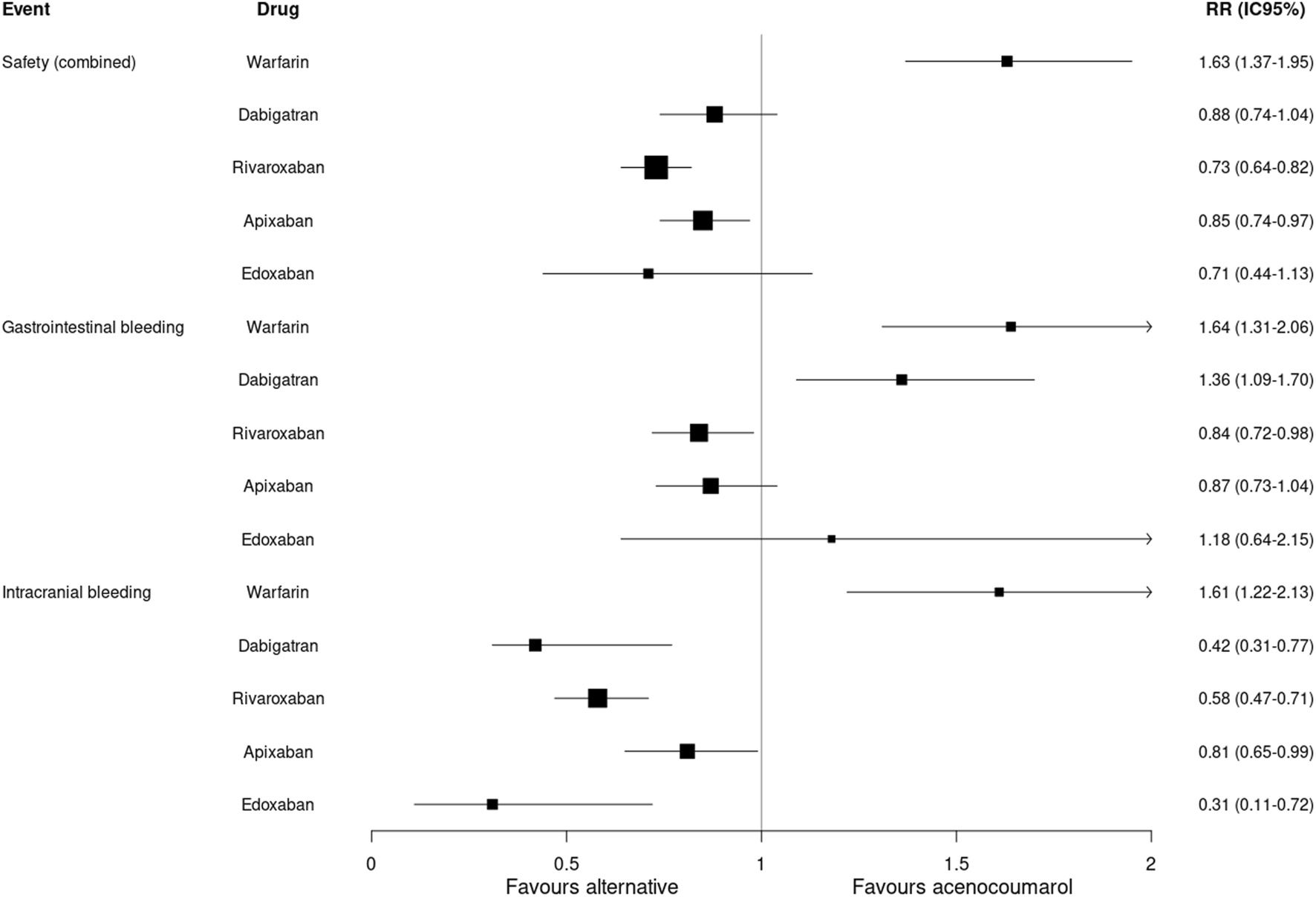 The analysis of incidence rates by matched cohorts (PSM) showed a lower incidence of combined safety events with rivaroxaban (RR: 0.73; 95%CI 0.64–0.82) and apixaban (RR: 0.85; 95%CI 0.74–0.97) compared to acenocoumarol. An increased risk of gastrointestinal bleeding was observed with dabigatran (RR: 1.36; 95%CI 1.09–1.70) and a lower risk with rivaroxaban (RR: 0.84; 95%CI 0.72–0.98). The risk of intracranial bleeding was lower for all 4 DOACs compared to acenocoumarol. Warfarin had a higher risk of combined safety events (RR: 1.63; 95%CI 1.37–1.95), gastrointestinal bleeding (RR: 1.64; 95%CI 1.31–2.06) and intracranial bleeding (RR: 1.61; 95%CI 1.22–2.13) compared to acenocoumarol (Table 3; Figure 3).