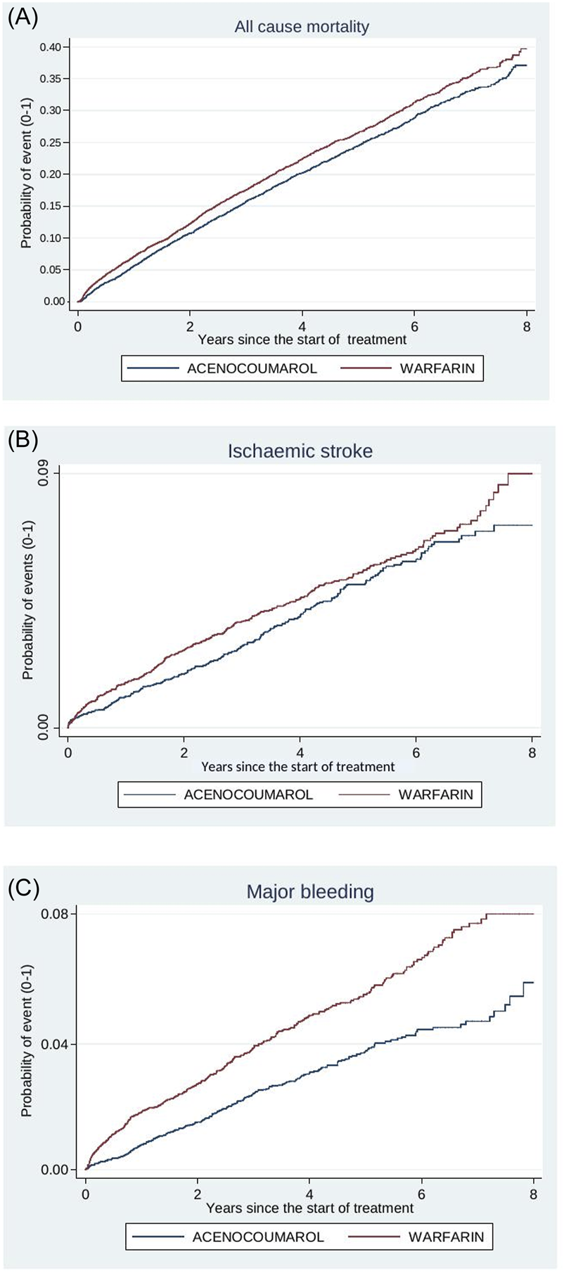 Figure 4. Acenocoumarol vs. warfarin. Crude cumulative incidence or failure curves of (A) “all-cause mortality”, (B) “ischaemic stroke”, and (C) “major bleeding” (intracranial or gastrointestinal bleeding) according to initiated treatment.